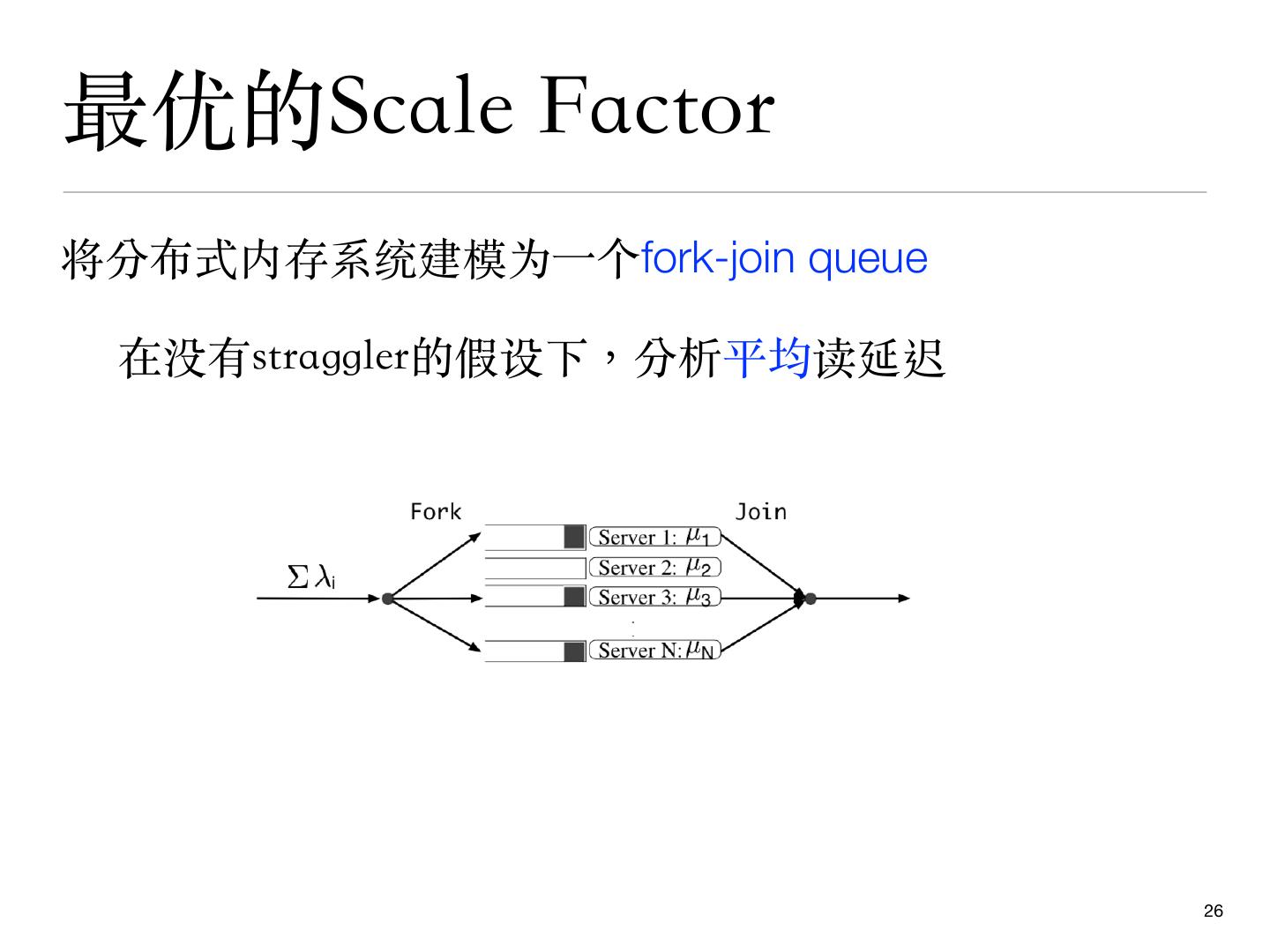 26 .最优的Scale Factor 将分布式内存系统建模为⼀个fork-join queue 在没有straggler的假设下,分析平均读延迟 26