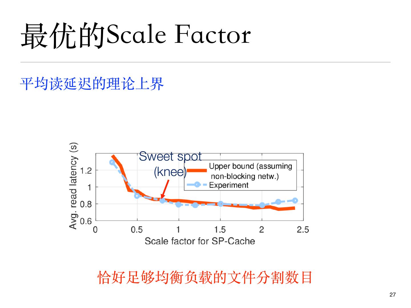 27 .最优的Scale Factor 平均读延迟的理论上界 Sweet spot (knee) 恰好⾜够均衡负载的⽂件分割数⽬ 27