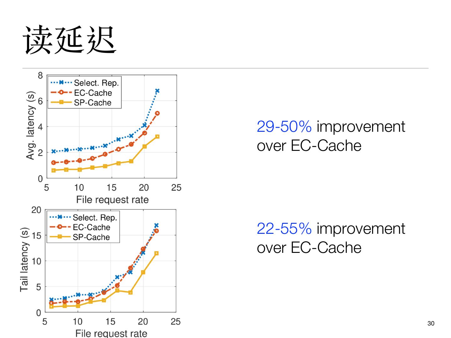 28 .性能评价 51个 r3.2xlarge 节点: 1 master, 30 servers 和 20 clients ⽂件热度服从Zipf分布 两个的现有策略 Ø EC-Cache: (10, 14) 纠删码 [Rashmi et al. OSDI’16] Ø Selective replication: 将top 10% 的热点⽂件各复制四份 28