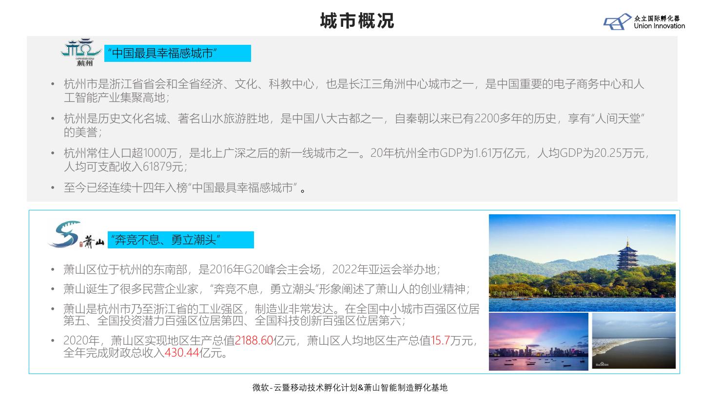 2 . 城市概况 众立国际孵化器 Union Innovation “中国最具幸福感城市” • 杭州市是浙江省省会和全省经济、文化、科教中心,也是长江三角洲中心城市之一,是中国重要的电子商务中心和人 工智能产业集聚高地; • 杭州是历史文化名城、著名山水旅游胜地,是中国八大古都之一,自秦朝以来已有2200多年的历史,享有“人间天堂” 的美誉; • 杭州常住人口超1000万,是北上广深之后的新一线城市之一。20年杭州全市GDP为1.61万亿元,人均GDP为20.25万元, 人均可支配收入61879元; • 至今已经连续十四年入榜“中国最具幸福感城市” 。 “奔竞不息、勇立潮头” • 萧山区位于杭州的东南部,是2016年G20峰会主会场,2022年亚运会举办地; • 萧山诞生了很多民营企业家,“奔竞不息,勇立潮头”形象阐述了萧山人的创业精神; • 萧山是杭州市乃至浙江省的工业强区,制造业非常发达。在全国中小城市百强区位居 第五、全国投资潜力百强区位居第四、全国科技创新百强区位居第六; • 2020年,萧山区实现地区生产总值2188.60亿元,萧山区人均地区生产总值15.7万元, 全年完成财政总收入430.44亿元。 微软-云暨移动技术孵化计划&萧山智能制造孵化基地