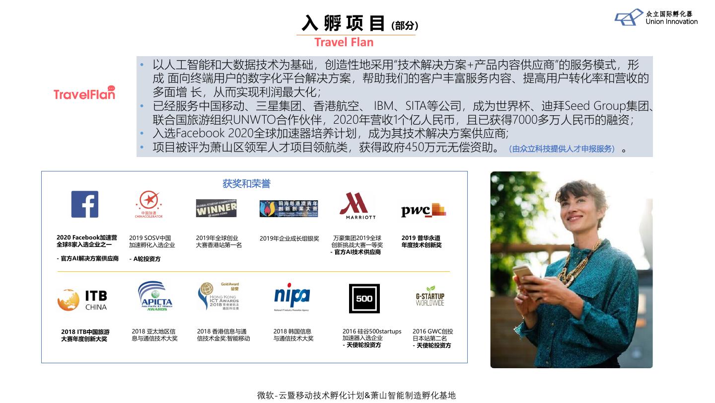 11 . 众立国际孵化器 入 孵 项 目(部分) Union Innovation Travel Flan • 以人工智能和大数据技术为基础,创造性地采用“技术解决方案+产品内容供应商”的服务模式,形 成 面向终端用户的数字化平台解决方案,帮助我们的客户丰富服务内容、提高用户转化率和营收的 多面增 长,从而实现利润最大化; • 已经服务中国移动、三星集团、香港航空、 IBM、SITA等公司,成为世界杯、迪拜Seed Group集团、 联合国旅游组织UNWTO合作伙伴,2020年营收1个亿人民币,且已获得7000多万人民币的融资; • 入选Facebook 2020全球加速器培养计划,成为其技术解决方案供应商; • 项目被评为萧山区领军人才项目领航类,获得政府450万元无偿资助。(由众立科技提供人才申报服务) 。 获奖和荣誉 2020 Facebook加速营 2019 SOSV中国 2019年全球创业 2019年企业成长组银奖 万豪集团2019全球 2019 普华永道 全球8家入选企业之一 加速孵化入选企业 大赛香港站第一名 创新挑战大赛一等奖 年度技术创新奖 - 官方AI技术供应商 - 官方AI解决方案供应商 - A轮投资方 2018 ITB中国旅游 2018 亚太地区信 2018 香港信息与通 2018 韩国信息 2016 硅谷500startups 2016 GWC创投 大赛年度创新大奖 息与通信技术大奖 信技术金奖:智能移动 与通信技术大奖 加速器入选企业 日本站第二名 - 天使轮投资方 - 天使轮投资方 微软-云暨移动技术孵化计划&萧山智能制造孵化基地
