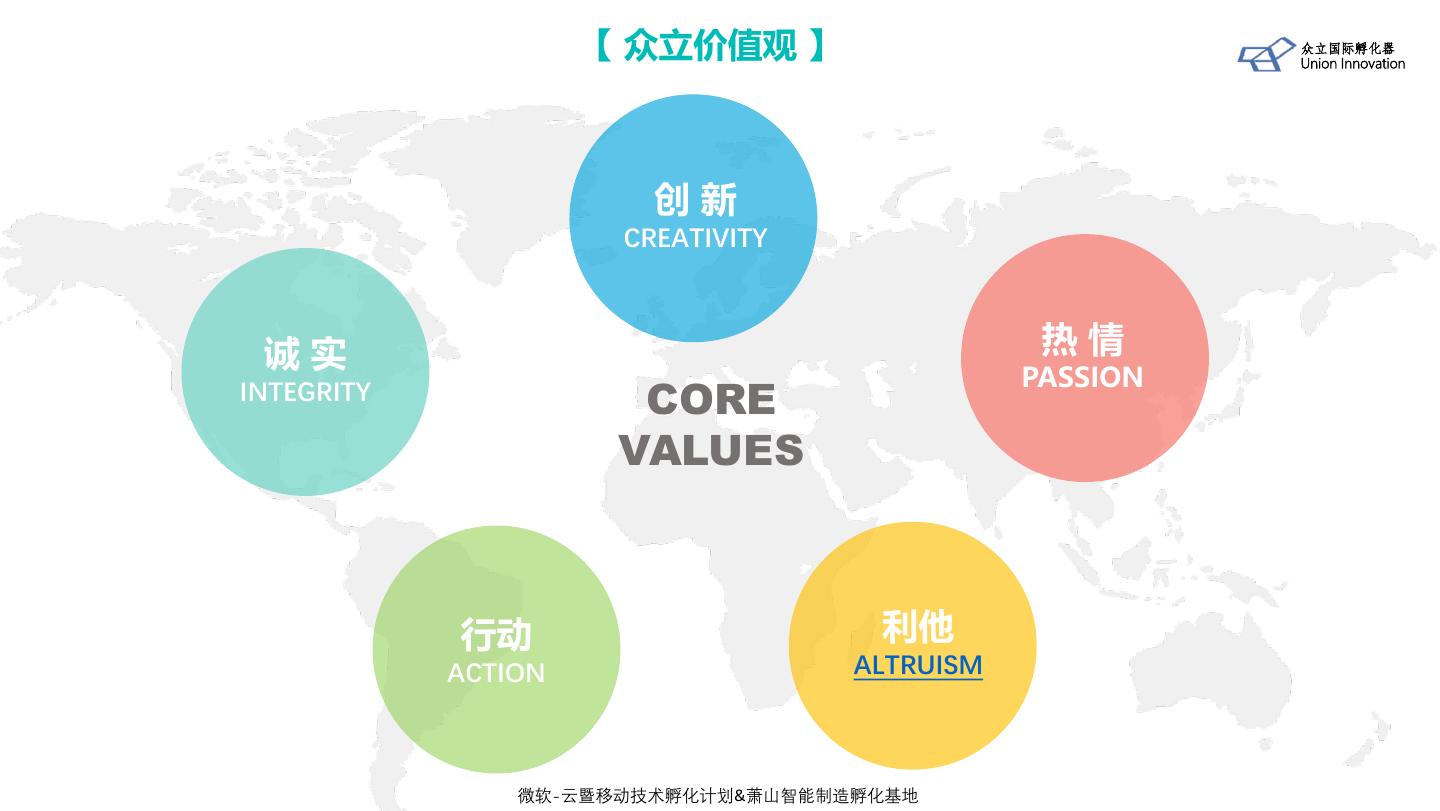 16 . 【 众立价值观 】 众立国际孵化器 Union Innovation 创新 CREATIVITY 诚实 热情 PASSION INTEGRITY CORE VALUES 行动 利他 ACTION ALTRUISM 微软-云暨移动技术孵化计划&萧山智能制造孵化基地