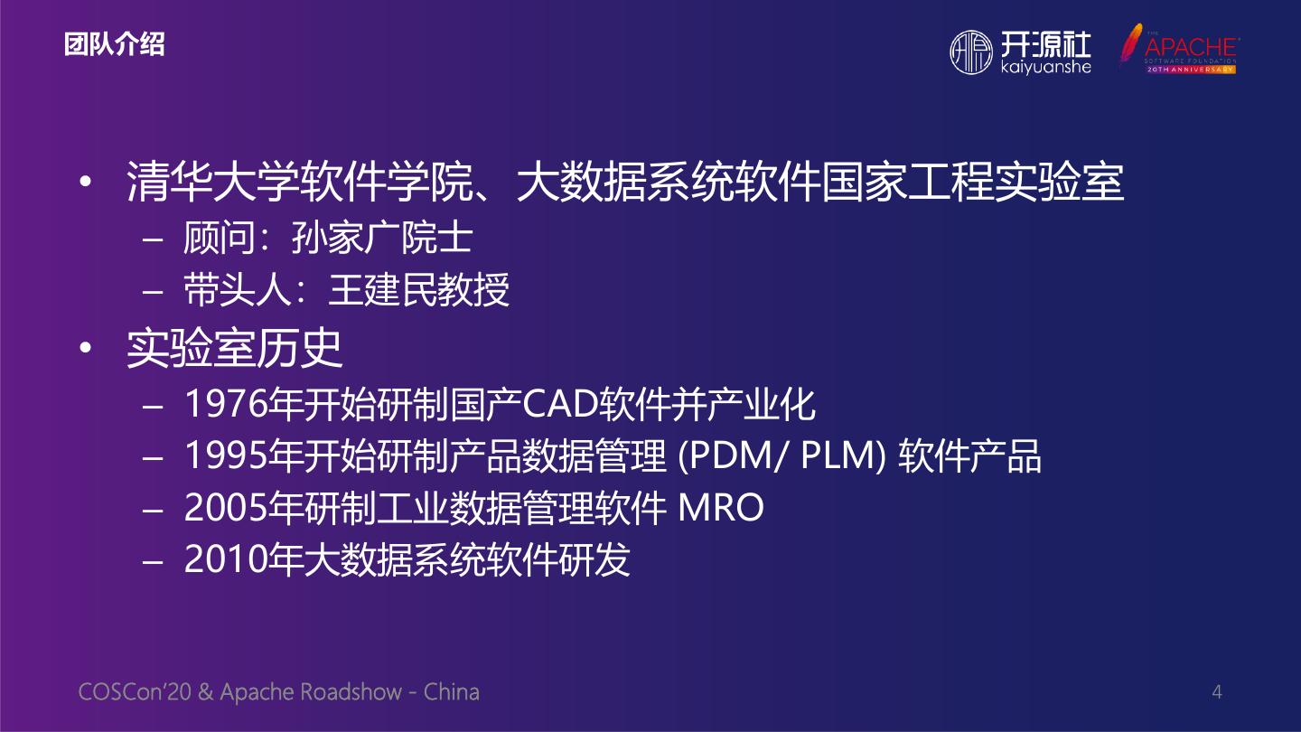 4 .团队介绍 • 清华大学软件学院、大数据系统软件国家工程实验室 – 顾问:孙家广院士 – 带头人:王建民教授 • 实验室历史 – 1976年开始研制国产CAD软件并产业化 – 1995年开始研制产品数据管理 (PDM/ PLM) 软件产品 – 2005年研制工业数据管理软件 MRO – 2010年大数据系统软件研发 COSCon’20 & Apache Roadshow - China 4