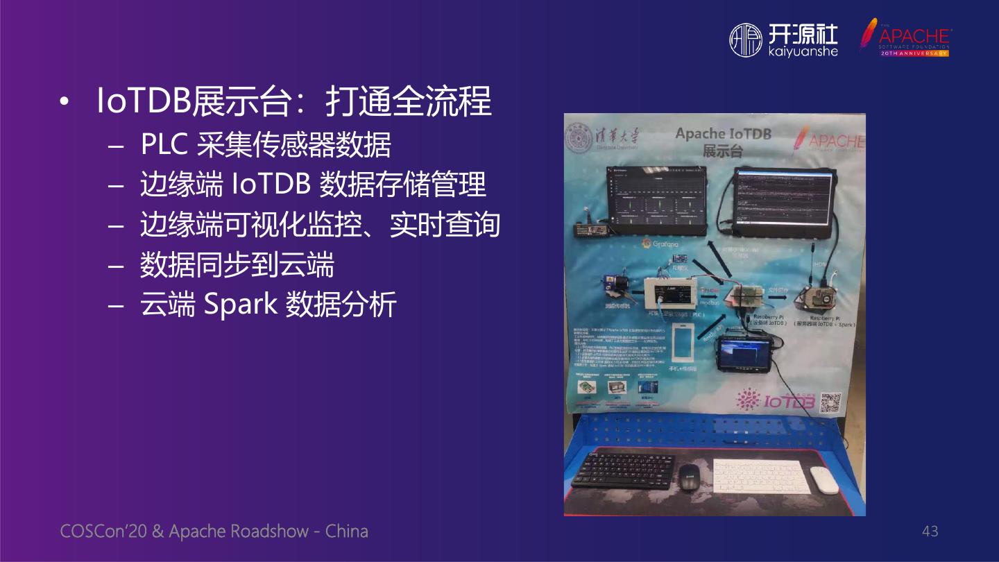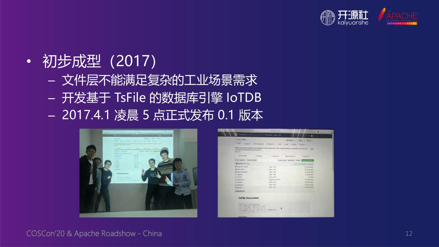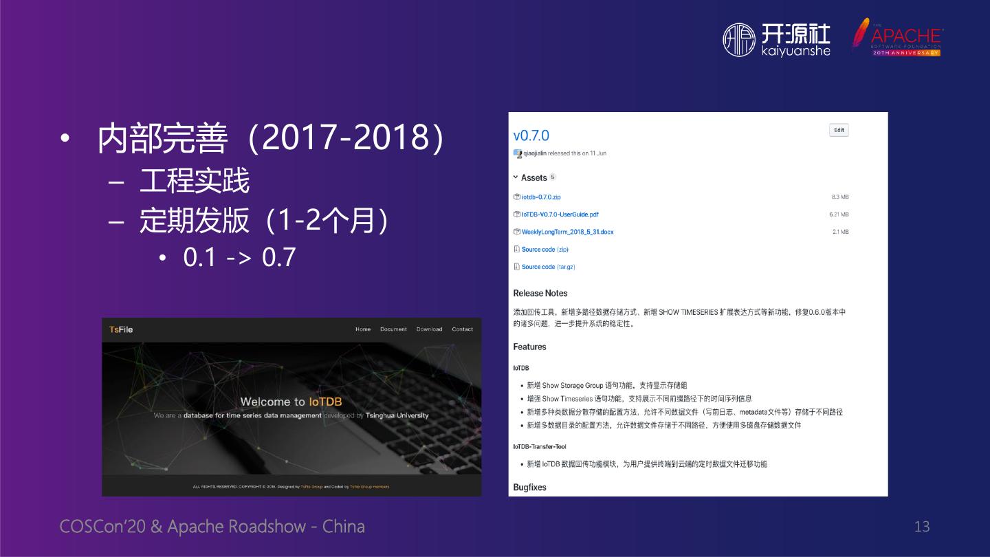 12 .• 初步成型(2017) – 文件层不能满足复杂的工业场景需求 – 开发基于 TsFile 的数据库引擎 IoTDB – 2017.4.1 凌晨 5 点正式发布 0.1 版本 COSCon’20 & Apache Roadshow - China 12