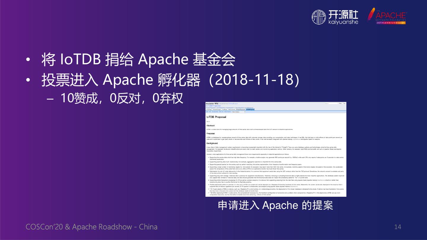 14 .• 将 IoTDB 捐给 Apache 基金会 • 投票进入 Apache 孵化器(2018-11-18) – 10赞成,0反对,0弃权 申请进入 Apache 的提案 COSCon’20 & Apache Roadshow - China 14