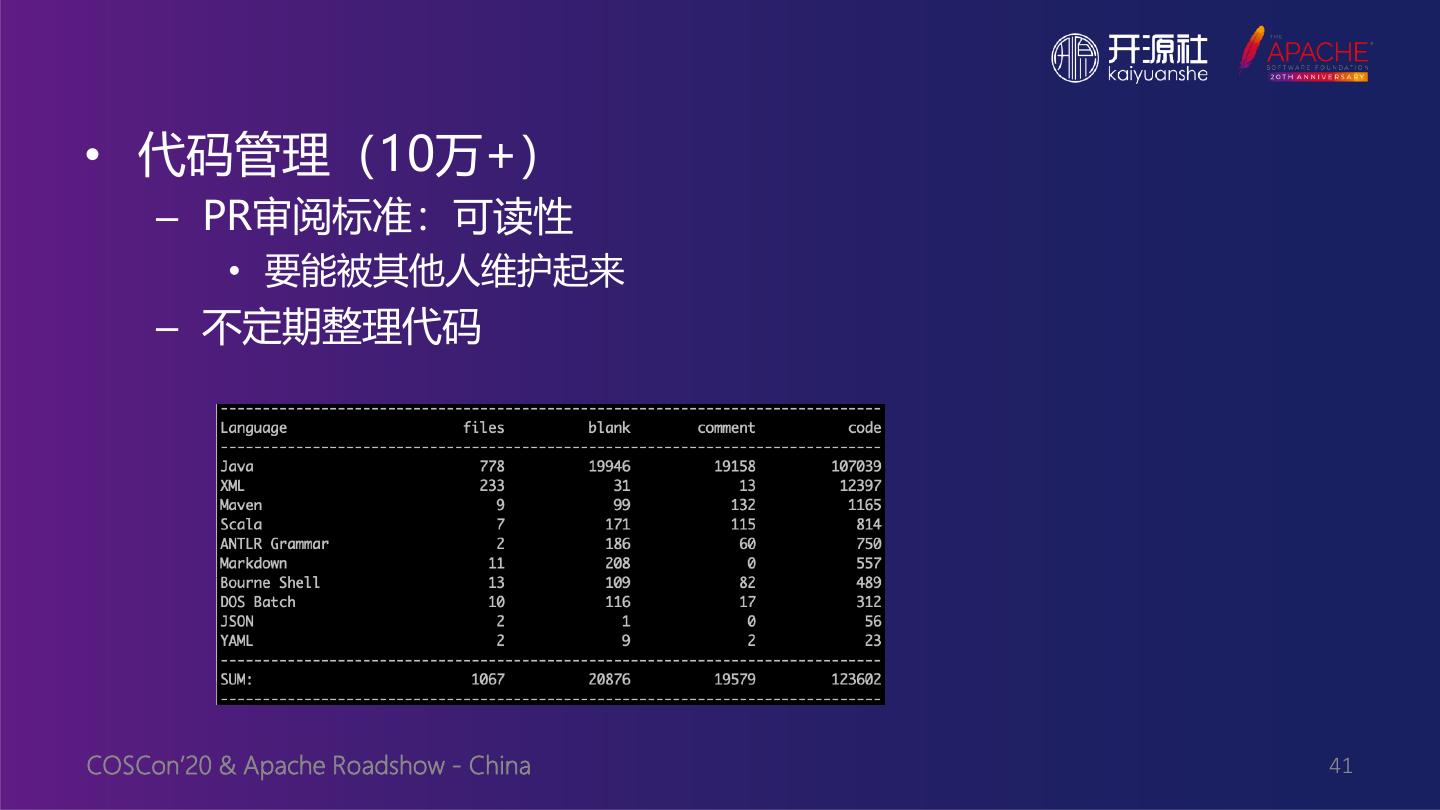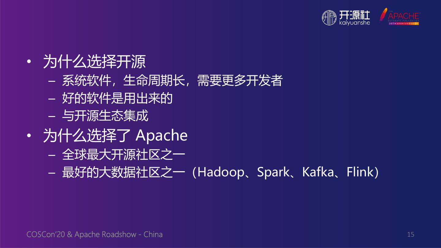 15 .• 为什么选择开源 – 系统软件,生命周期长,需要更多开发者 – 好的软件是用出来的 – 与开源生态集成 • 为什么选择了 Apache – 全球最大开源社区之一 – 最好的大数据社区之一(Hadoop、Spark、Kafka、Flink) COSCon’20 & Apache Roadshow - China 15