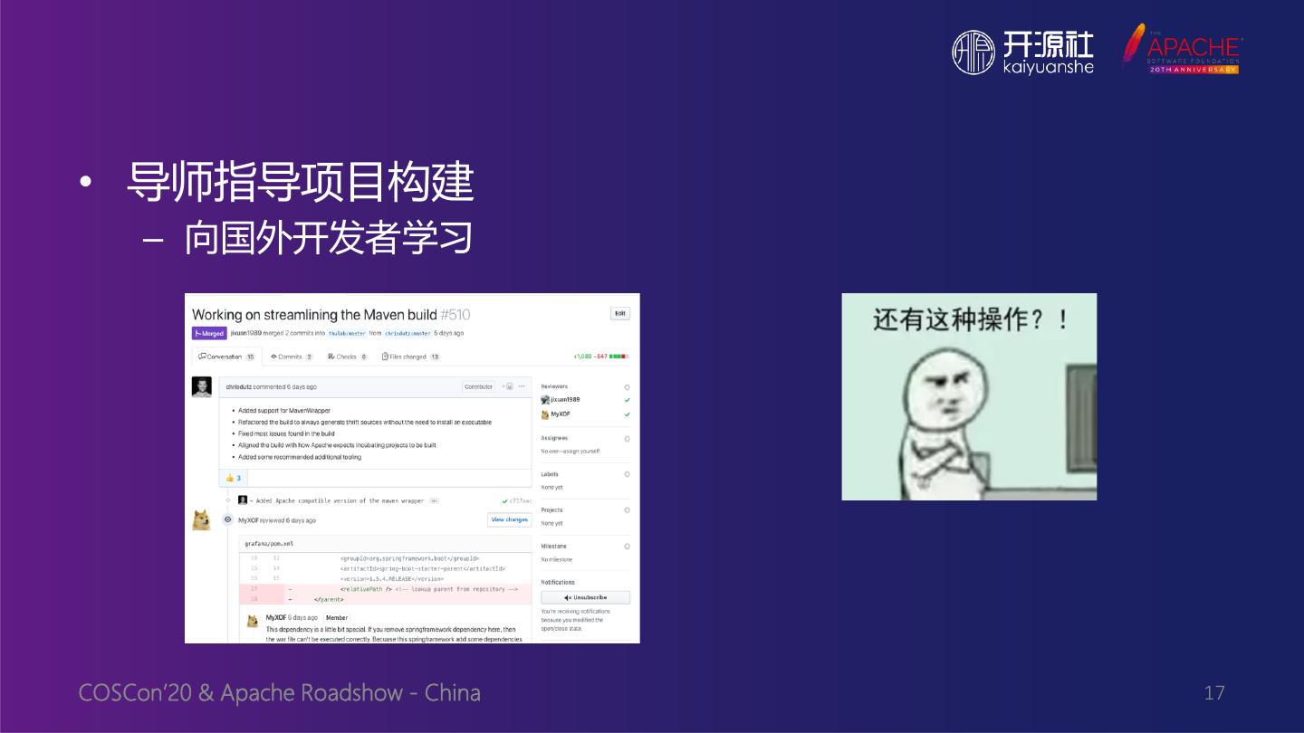 17 .• 导师指导项目构建 – 向国外开发者学习 COSCon’20 & Apache Roadshow - China 17