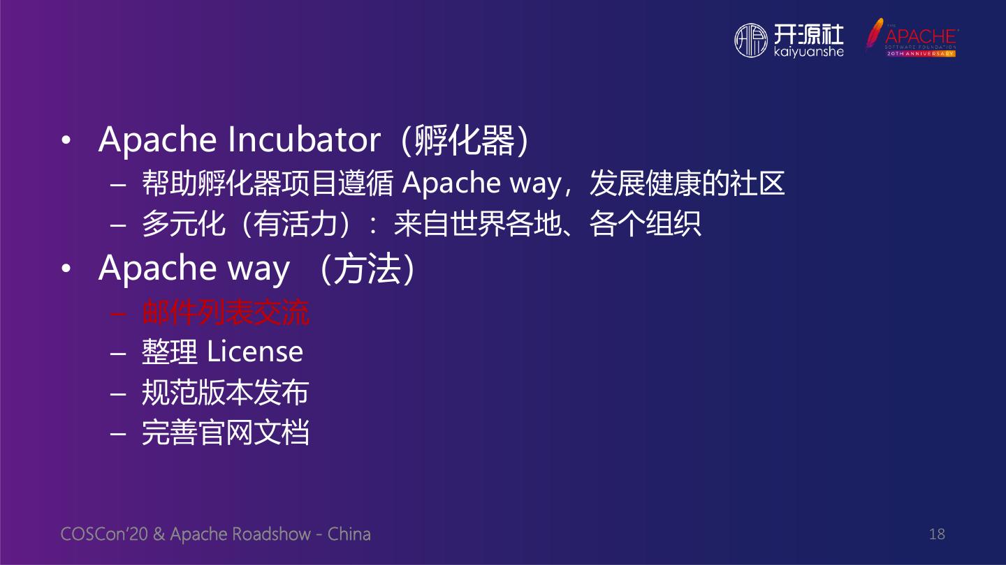 18 .• Apache Incubator(孵化器) – 帮助孵化器项目遵循 Apache way,发展健康的社区 – 多元化(有活力):来自世界各地、各个组织 • Apache way (方法) – 邮件列表交流 – 整理 License – 规范版本发布 – 完善官网文档 COSCon’20 & Apache Roadshow - China 18