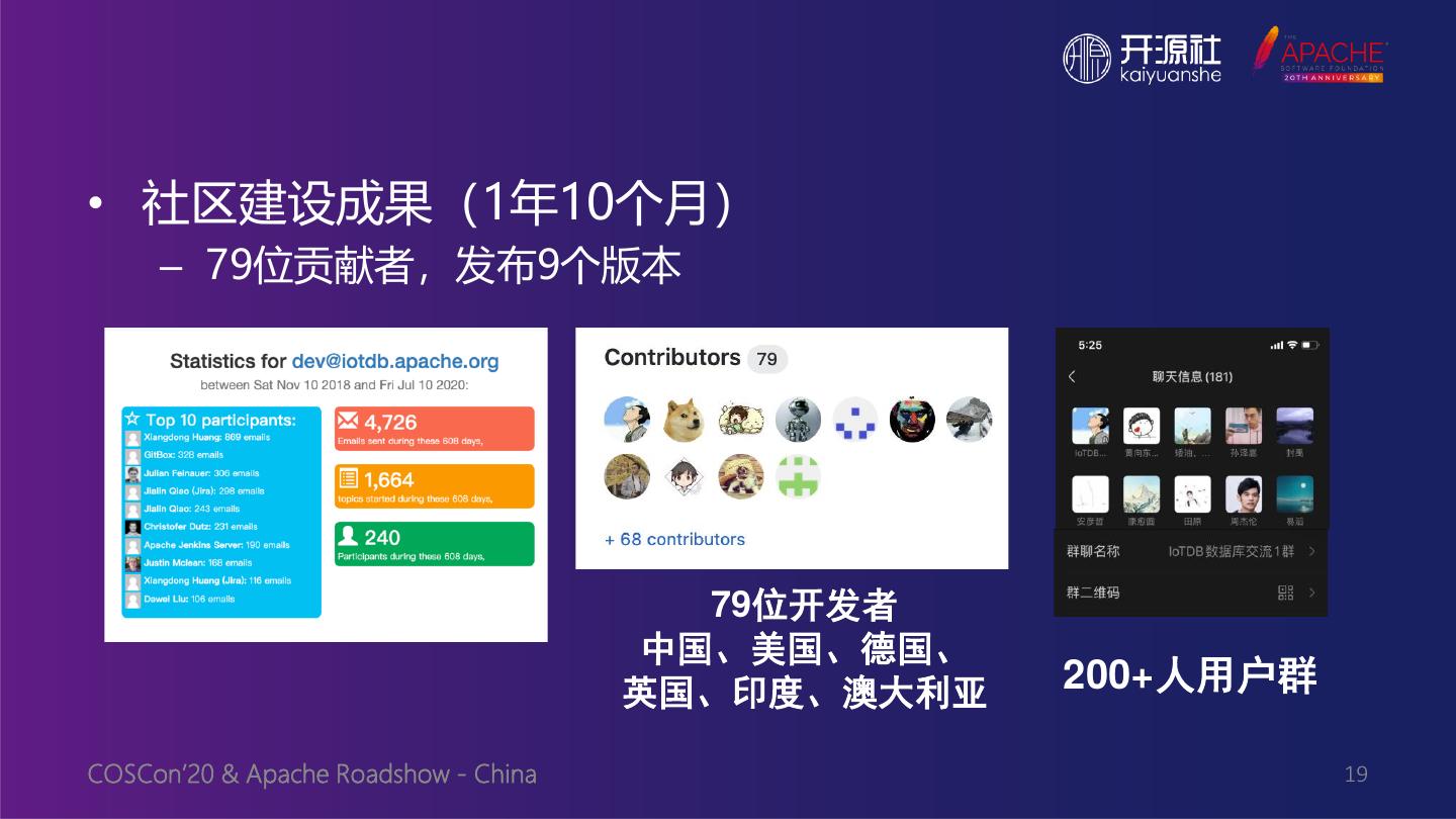 19 .• 社区建设成果(1年10个月) – 79位贡献者,发布9个版本 79位开发者 中国、美国、德国、 英国、印度、澳大利亚 200+人用户群 COSCon’20 & Apache Roadshow - China 19