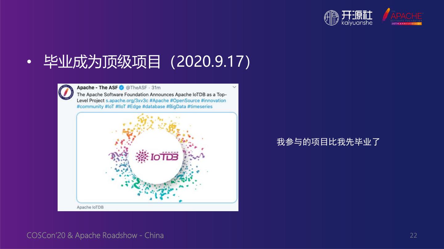 22 .• 毕业成为顶级项目(2020.9.17) 我参与的项目比我先毕业了 COSCon’20 & Apache Roadshow - China 22