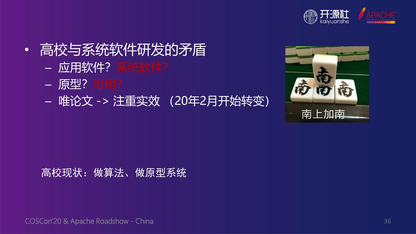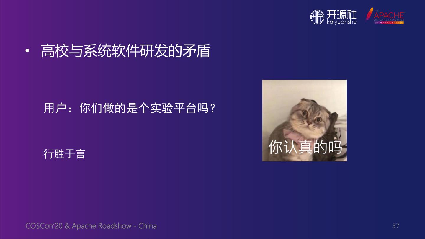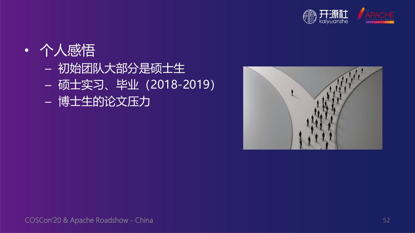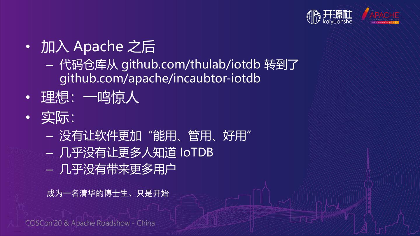24 .• 加入 Apache 之后 – 代码仓库从 github.com/thulab/iotdb 转到了 github.com/apache/incaubtor-iotdb • 理想:一鸣惊人 • 实际: – 没有让软件更加“能用、管用、好用” – 几乎没有让更多人知道 IoTDB – 几乎没有带来更多用户 成为一名清华的博士生、只是开始 COSCon’20 & Apache Roadshow - China