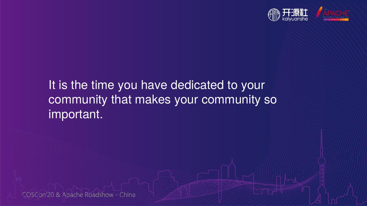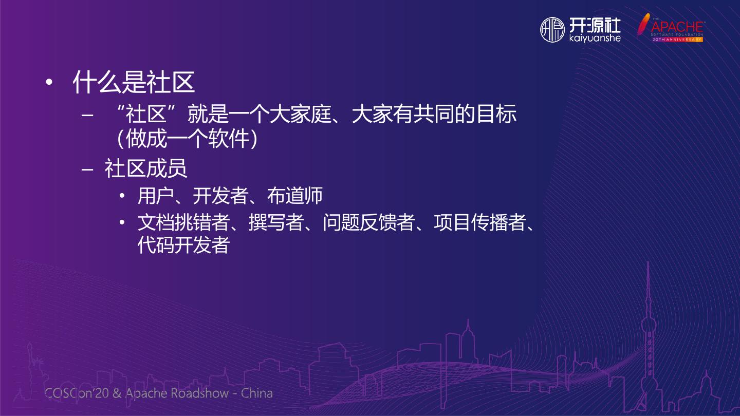 25 .• 什么是社区 – “社区”就是一个大家庭、大家有共同的目标 (做成一个软件) – 社区成员 • 用户、开发者、布道师 • 文档挑错者、撰写者、问题反馈者、项目传播者、 代码开发者 COSCon’20 & Apache Roadshow - China