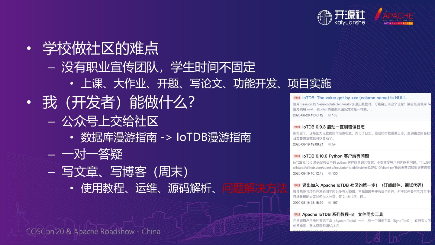 26 .• 学校做社区的难点 – 没有职业宣传团队,学生时间不固定 • 上课、大作业、开题、写论文、功能开发、项目实施 • 我(开发者)能做什么? – 公众号上交给社区 • 数据库漫游指南 -> IoTDB漫游指南 – 一对一答疑 – 写文章、写博客(周末) • 使用教程、运维、源码解析、问题解决方法 COSCon’20 & Apache Roadshow - China