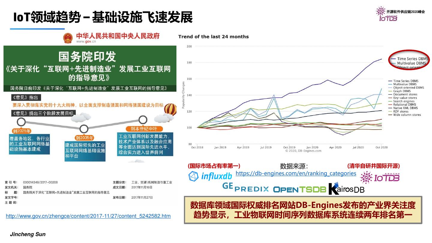 6 . IoT领域趋势 – 基础设施飞速发展 (国际市场占有率第一) 数据来源: (清华自研并国际开源) https://db-engines.com/en/ranking_categories GE 数据库领域国际权威排名网站DB-Engines发布的产业界关注度 http://www.gov.cn/zhengce/content/2017-11/27/content_5242582.htm 趋势显示,工业物联网时间序列数据库系统连续两年排名第一 Jincheng Sun