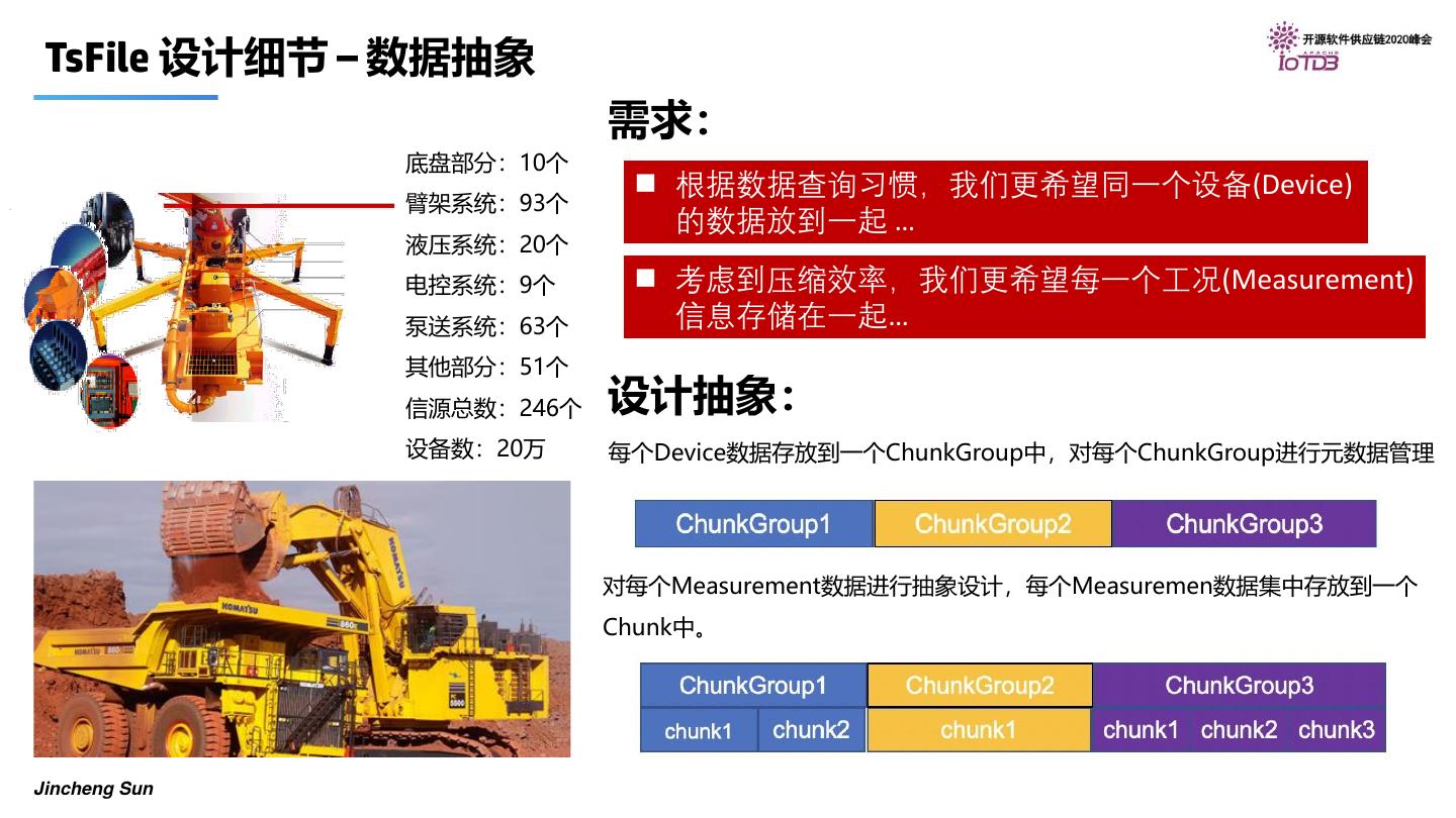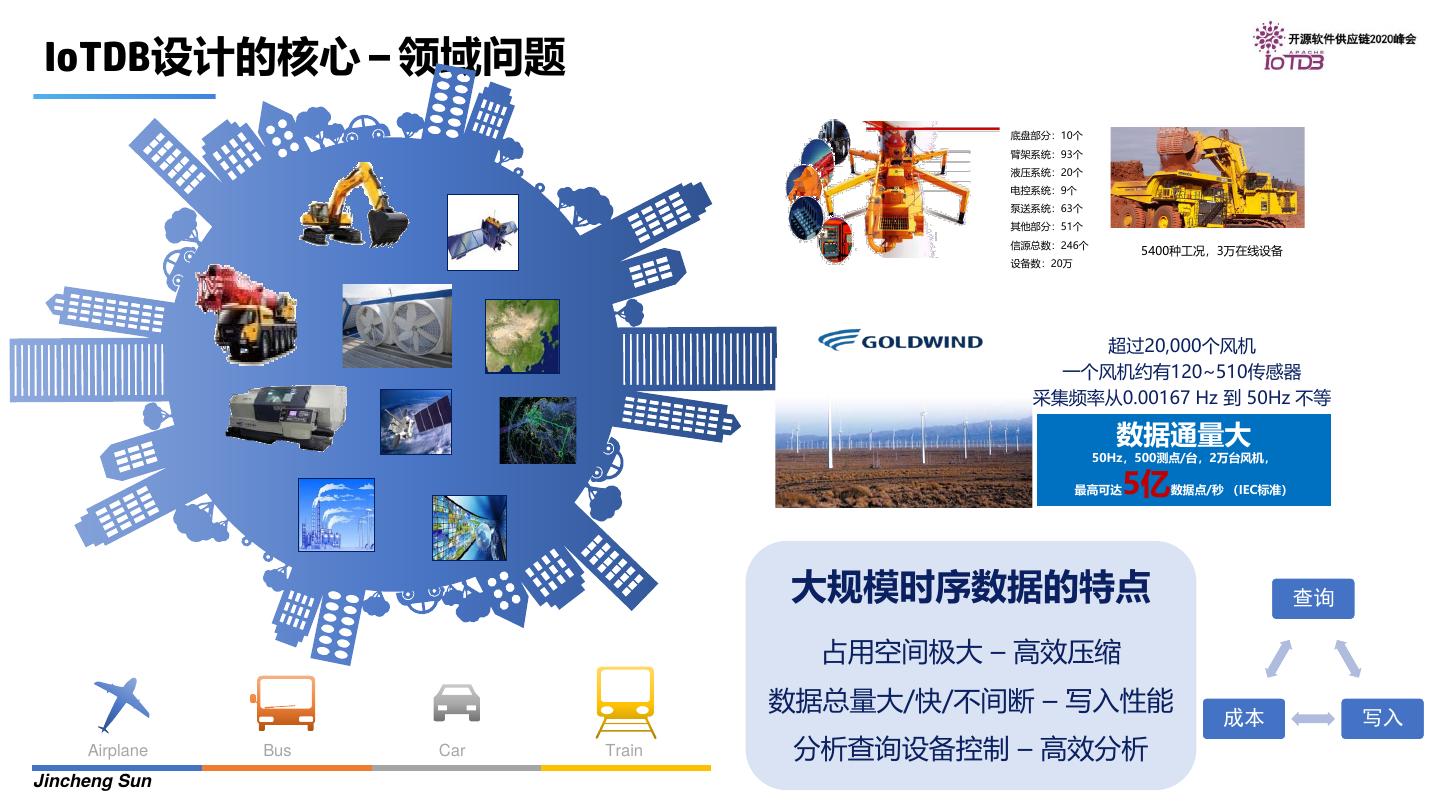 10 . IoTDB设计的核心 – 领域问题 底盘部分:10个 臂架系统:93个 液压系统:20个 电控系统:9个 泵送系统:63个 其他部分:51个 信源总数:246个 5400种工况,3万在线设备 设备数:20万 超过20,000个风机 一个风机约有120~510传感器 采集频率从0.00167 Hz 到 50Hz 不等 数据通量大 50Hz,500测点/台,2万台风机, 最高可达 5亿 数据点/秒 (IEC标准) 大规模时序数据的特点 查询 占用空间极大 – 高效压缩 数据总量大/快/不间断 – 写入性能 成本 写入 Airplane Bus Car Train 分析查询设备控制 – 高效分析 Jincheng Sun