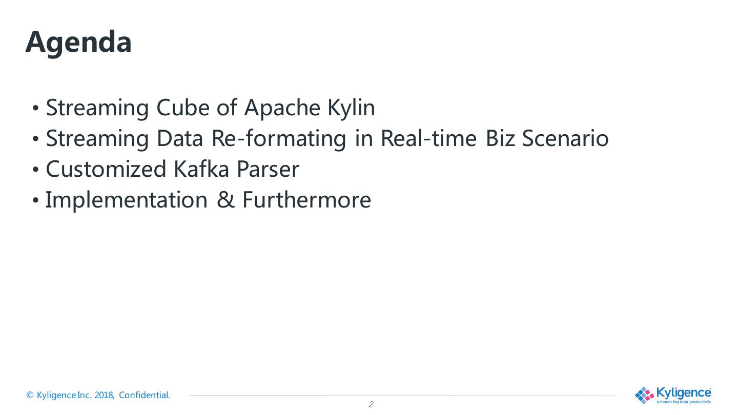 2 .Agenda • Streaming Cube of Apache Kylin • Streaming Data Re-formating in Real-time Biz Scenario • Customized Kafka Parser • Implementation & Furthermore © Kyligence Inc. 2018, Confidential. 2