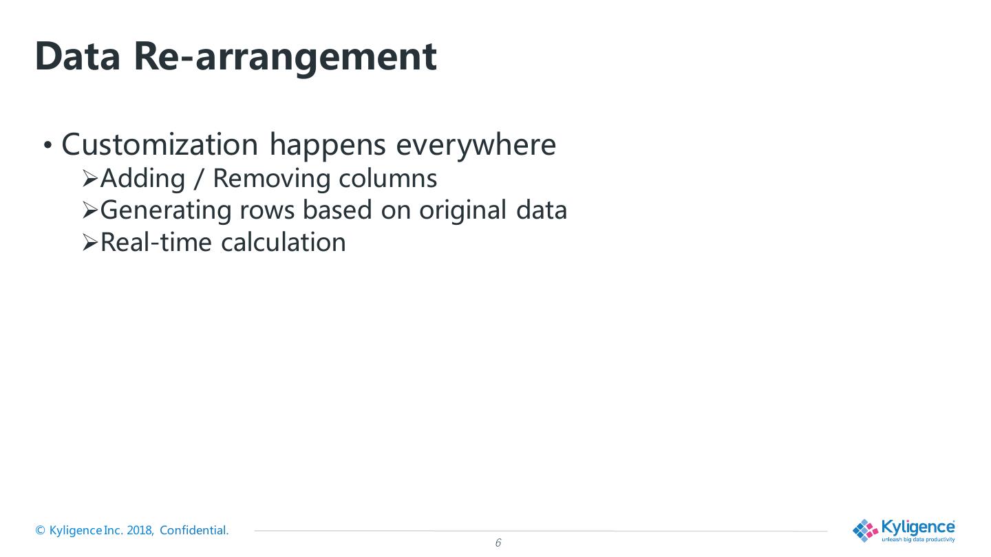 6 .Data Re-arrangement • Customization happens everywhere ØAdding / Removing columns ØGenerating rows based on original data ØReal-time calculation © Kyligence Inc. 2018, Confidential. 6