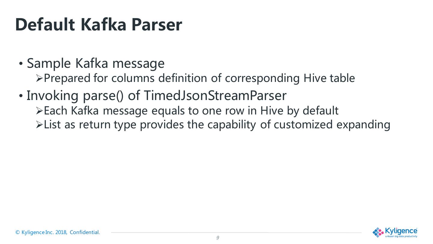 9 .Default Kafka Parser • Sample Kafka message ØPrepared for columns definition of corresponding Hive table • Invoking parse() of TimedJsonStreamParser ØEach Kafka message equals to one row in Hive by default ØList as return type provides the capability of customized expanding © Kyligence Inc. 2018, Confidential. 9