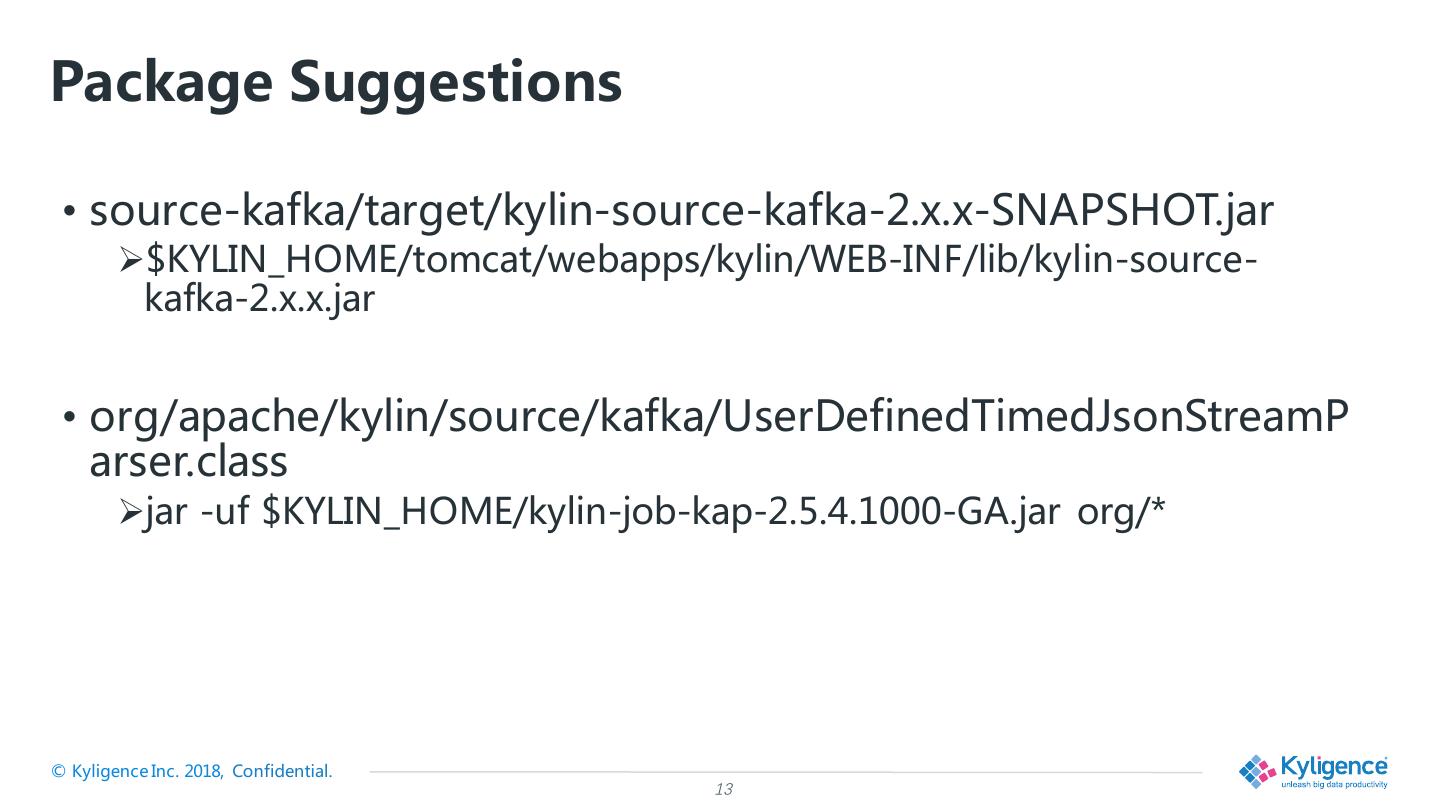 13 .Package Suggestions • source-kafka/target/kylin-source-kafka-2.x.x-SNAPSHOT.jar Ø$KYLIN_HOME/tomcat/webapps/kylin/WEB-INF/lib/kylin-source- kafka-2.x.x.jar • org/apache/kylin/source/kafka/UserDefinedTimedJsonStreamP arser.class Øjar -uf $KYLIN_HOME/kylin-job-kap-2.5.4.1000-GA.jar org/* © Kyligence Inc. 2018, Confidential. 13