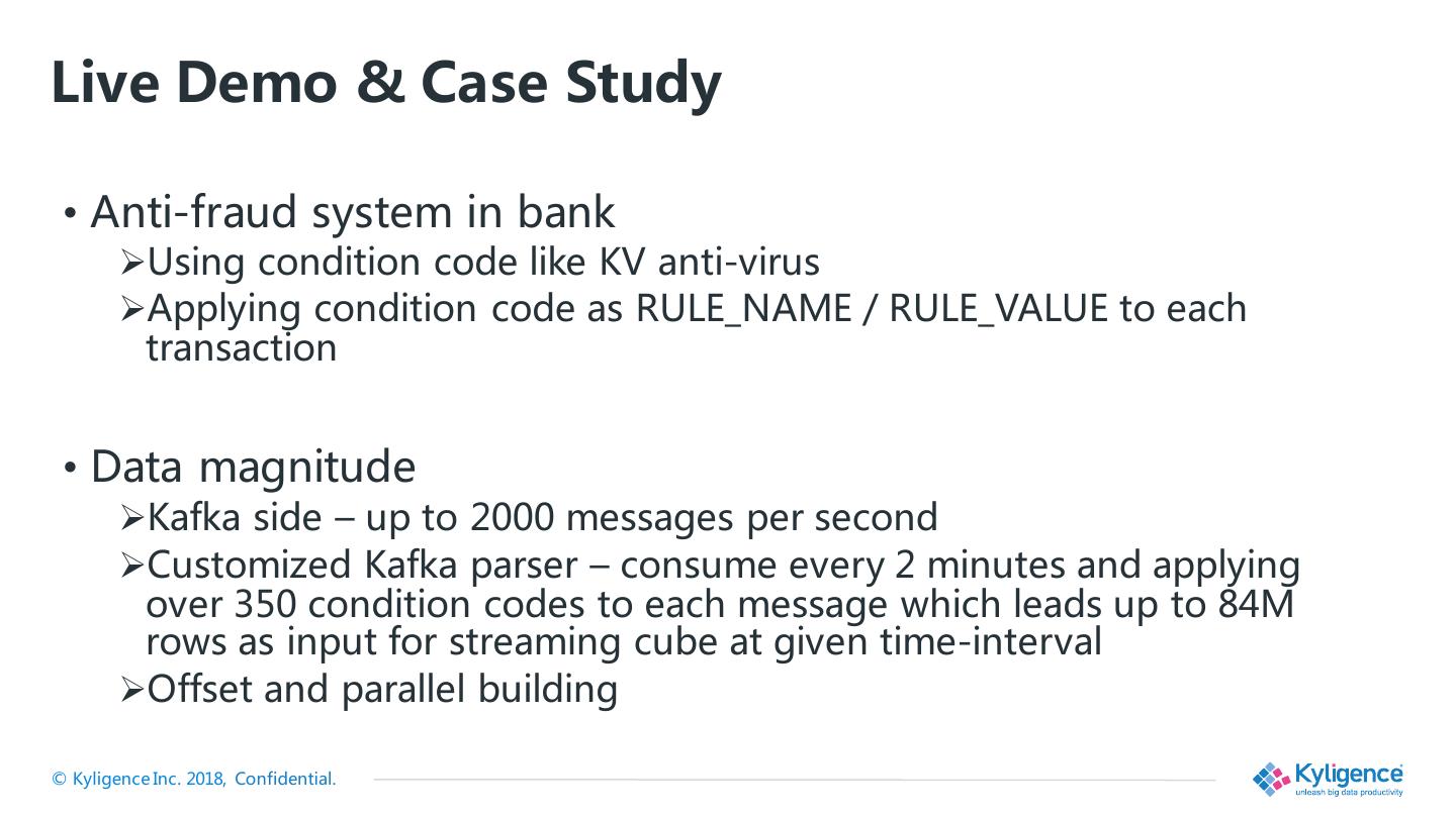 14 .Live Demo & Case Study • Anti-fraud system in bank ØUsing condition code like KV anti-virus ØApplying condition code as RULE_NAME / RULE_VALUE to each transaction • Data magnitude ØKafka side – up to 2000 messages per second ØCustomized Kafka parser – consume every 2 minutes and applying over 350 condition codes to each message which leads up to 84M rows as input for streaming cube at given time-interval ØOffset and parallel building © Kyligence Inc. 2018, Confidential.