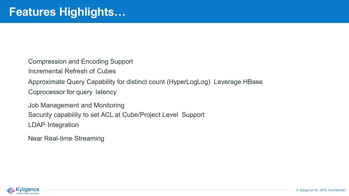 7 .Features Highlights… Compression and Encoding Support Incremental Refresh of Cubes Approximate Query Capability for distinct count (HyperLogLog) Leverage HBase Coprocessor for query latency Job Management and Monitoring Security capability to set ACL at Cube/Project Level Support LDAP Integration Near Real-time Streaming 1 0, . ,