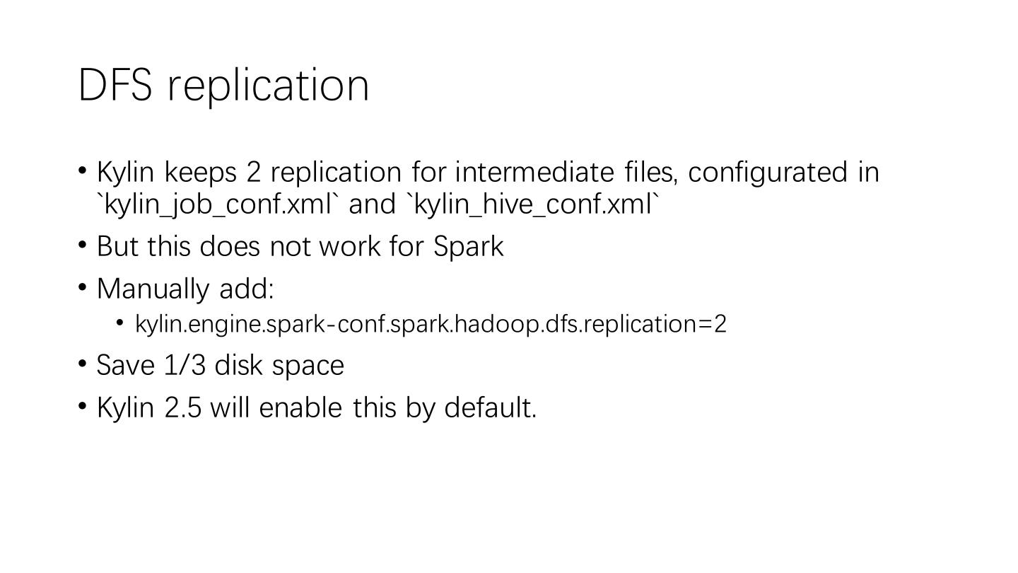 22 .DFS replication • Kylin keeps 2 replication for intermediate files, configurated in `kylin_job_conf.xml` and `kylin_hive_conf.xml` • But this does not work for Spark • Manually add: • kylin.engine.spark-conf.spark.hadoop.dfs.replication=2 • Save 1/3 disk space • Kylin 2.5 will enable this by default.