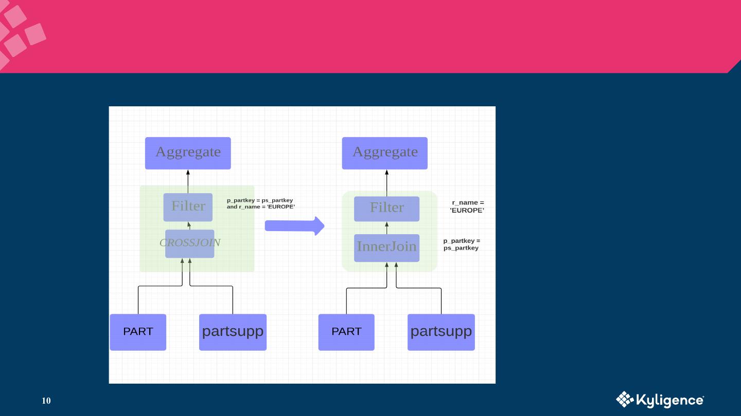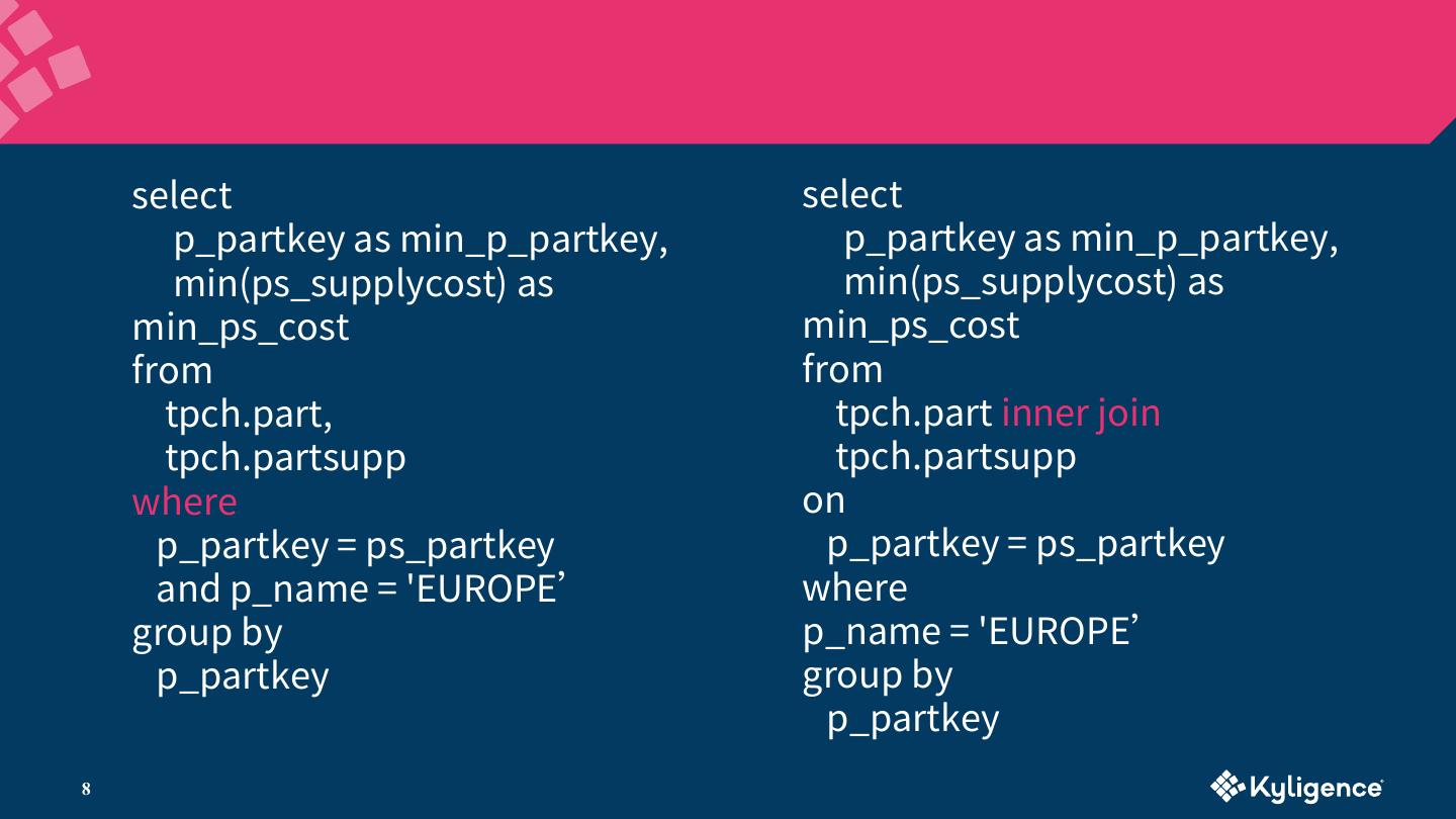 8 . select select p_partkey as min_p_partkey, p_partkey as min_p_partkey, min(ps_supplycost) as min(ps_supplycost) as min_ps_cost min_ps_cost from from tpch.part, tpch.part inner join tpch.partsupp tpch.partsupp where on p_partkey = ps_partkey p_partkey = ps_partkey and p_name = 'EUROPE where group by p_name = 'EUROPE p_partkey group by p_partkey 8