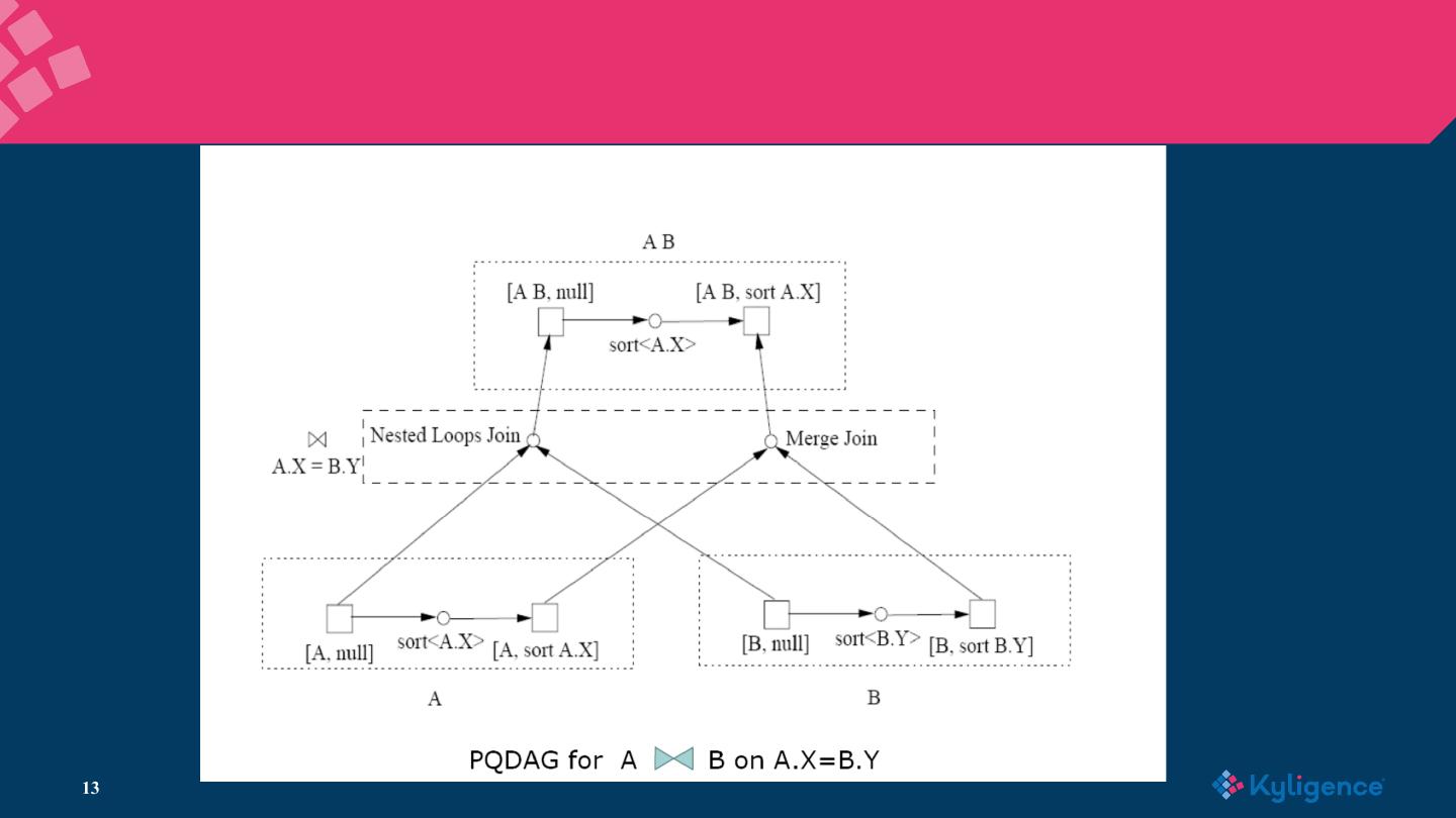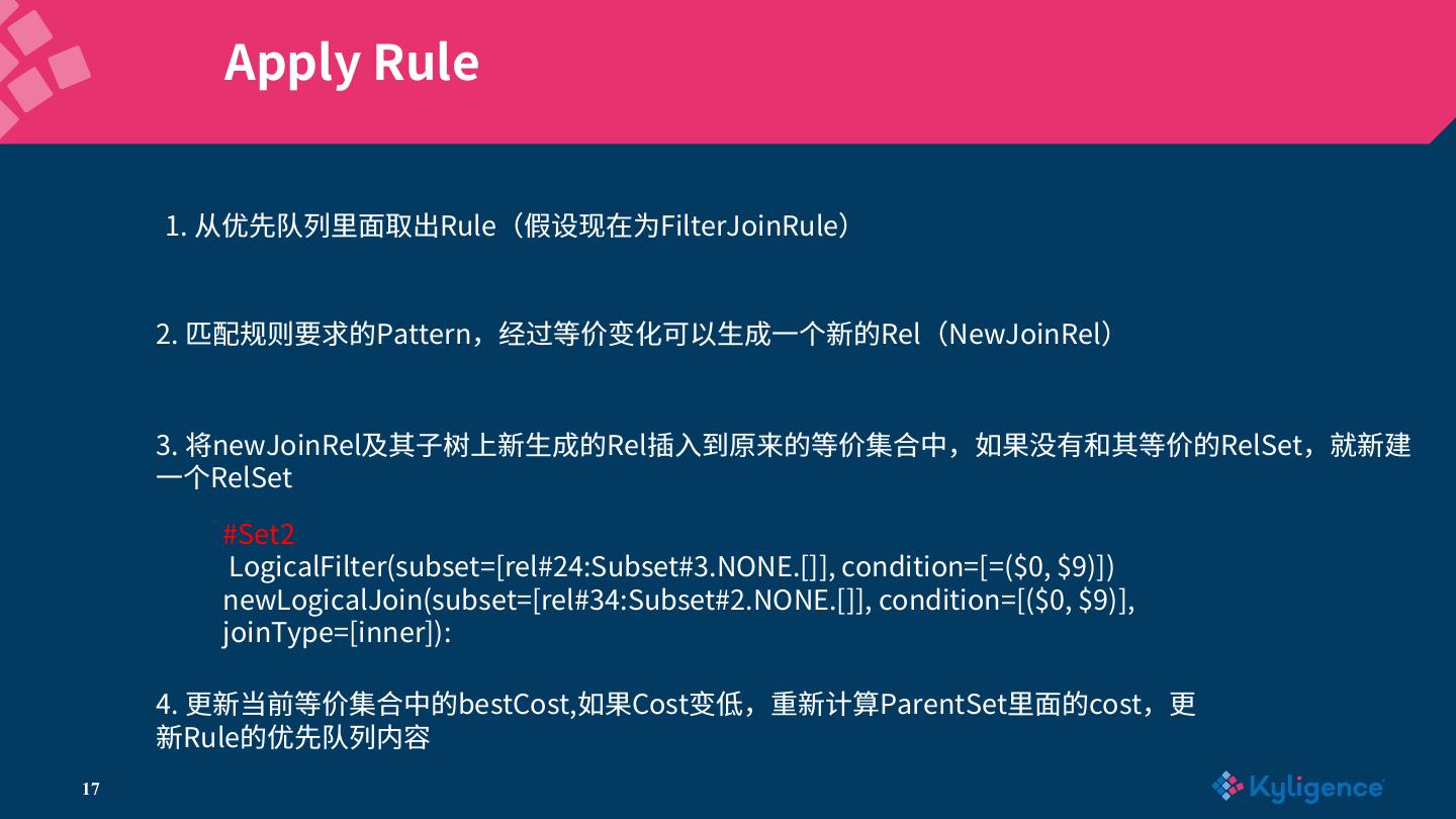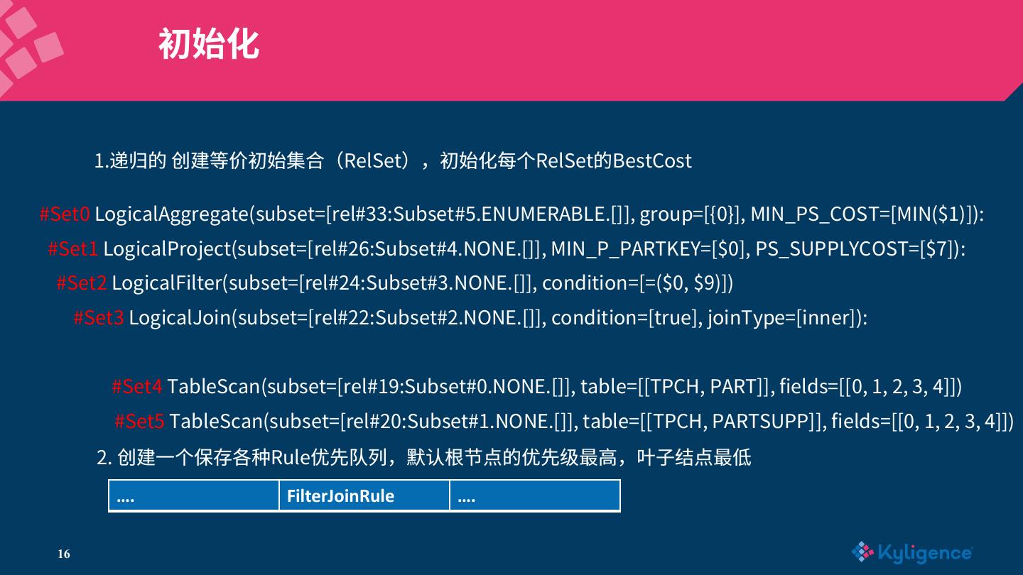 16 . 1. RelSet RelSet BestCost #Set0 LogicalAggregate(subset=[rel#33:Subset#5.ENUMERABLE.[]], group=[{0}], MIN_PS_COST=[MIN($1)]): #Set1 LogicalProject(subset=[rel#26:Subset#4.NONE.[]], MIN_P_PARTKEY=[$0], PS_SUPPLYCOST=[$7]): #Set2 LogicalFilter(subset=[rel#24:Subset#3.NONE.[]], condition=[=($0, $9)]) #Set3 LogicalJoin(subset=[rel#22:Subset#2.NONE.[]], condition=[true], joinType=[inner]): #Set4 TableScan(subset=[rel#19:Subset#0.NONE.[]], table=[[TPCH, PART]], fields=[[0, 1, 2, 3, 4]]) #Set5 TableScan(subset=[rel#20:Subset#1.NONE.[]], table=[[TPCH, PARTSUPP]], fields=[[0, 1, 2, 3, 4]]) 2. Rule …. FilterJoinRule …. 16