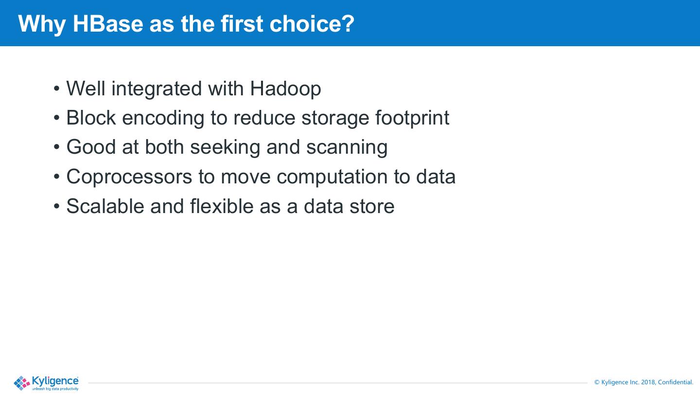 7 .Why HBase as the first choice? • Well integrated with Hadoop • Block encoding to reduce storage footprint • Good at both seeking and scanning • Coprocessors to move computation to data • Scalable and flexible as a data store 1 0, . ,