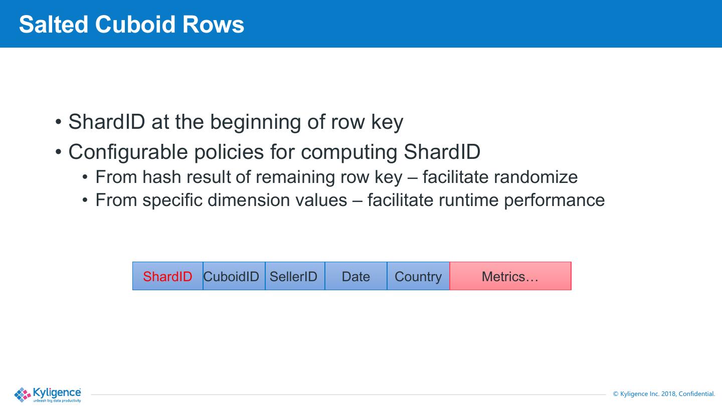 14 .Salted Cuboid Rows • ShardID at the beginning of row key • Configurable policies for computing ShardID • From hash result of remaining row key – facilitate randomize • From specific dimension values – facilitate runtime performance ShardID CuboidID SellerID Date Country Metrics… 1 0, . ,