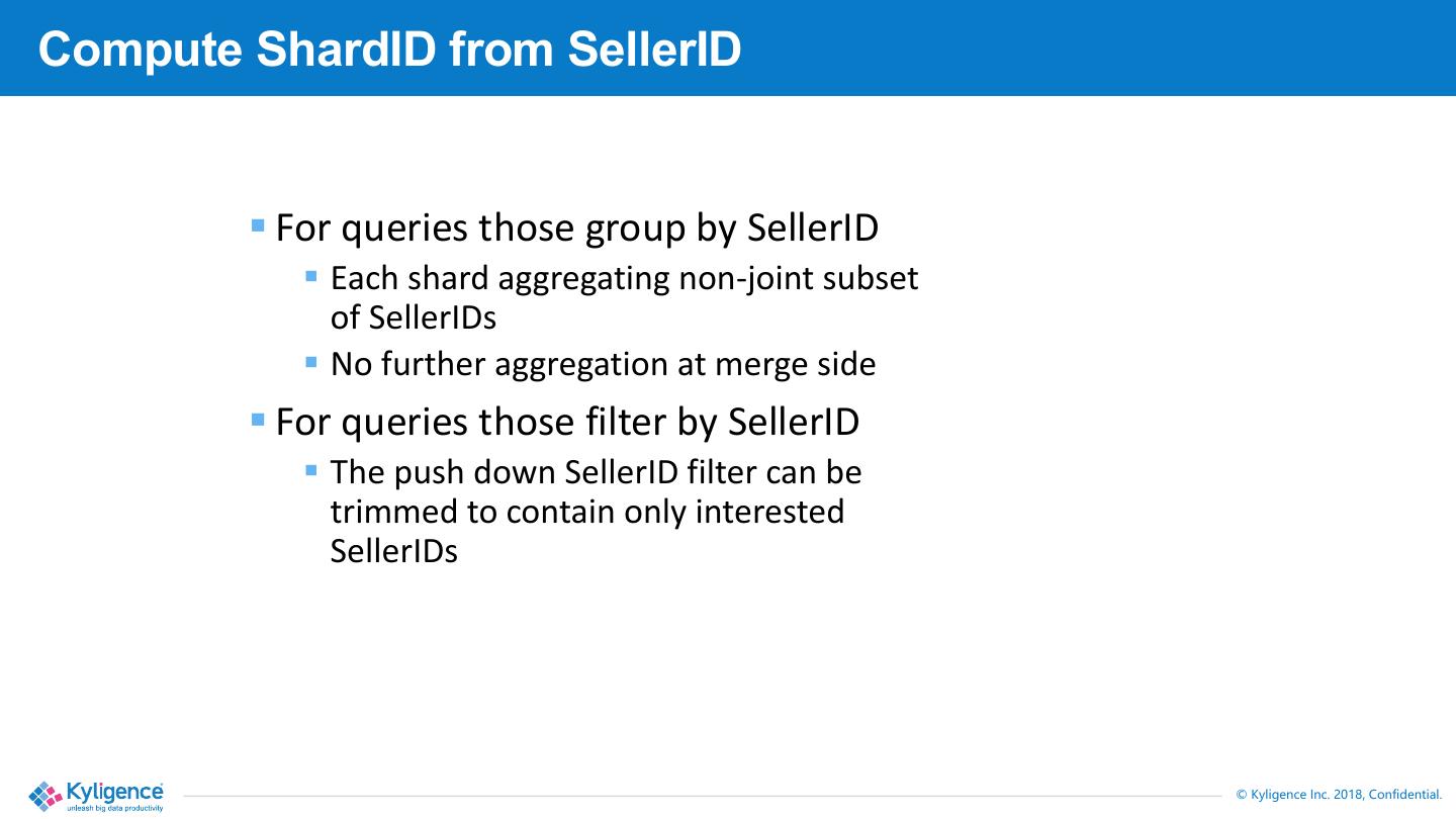 15 .Compute ShardID from SellerID § For queries those group by SellerID § Each shard aggregating non-joint subset of SellerIDs § No further aggregation at merge side § For queries those filter by SellerID § The push down SellerID filter can be trimmed to contain only interested SellerIDs 1 0, . ,
