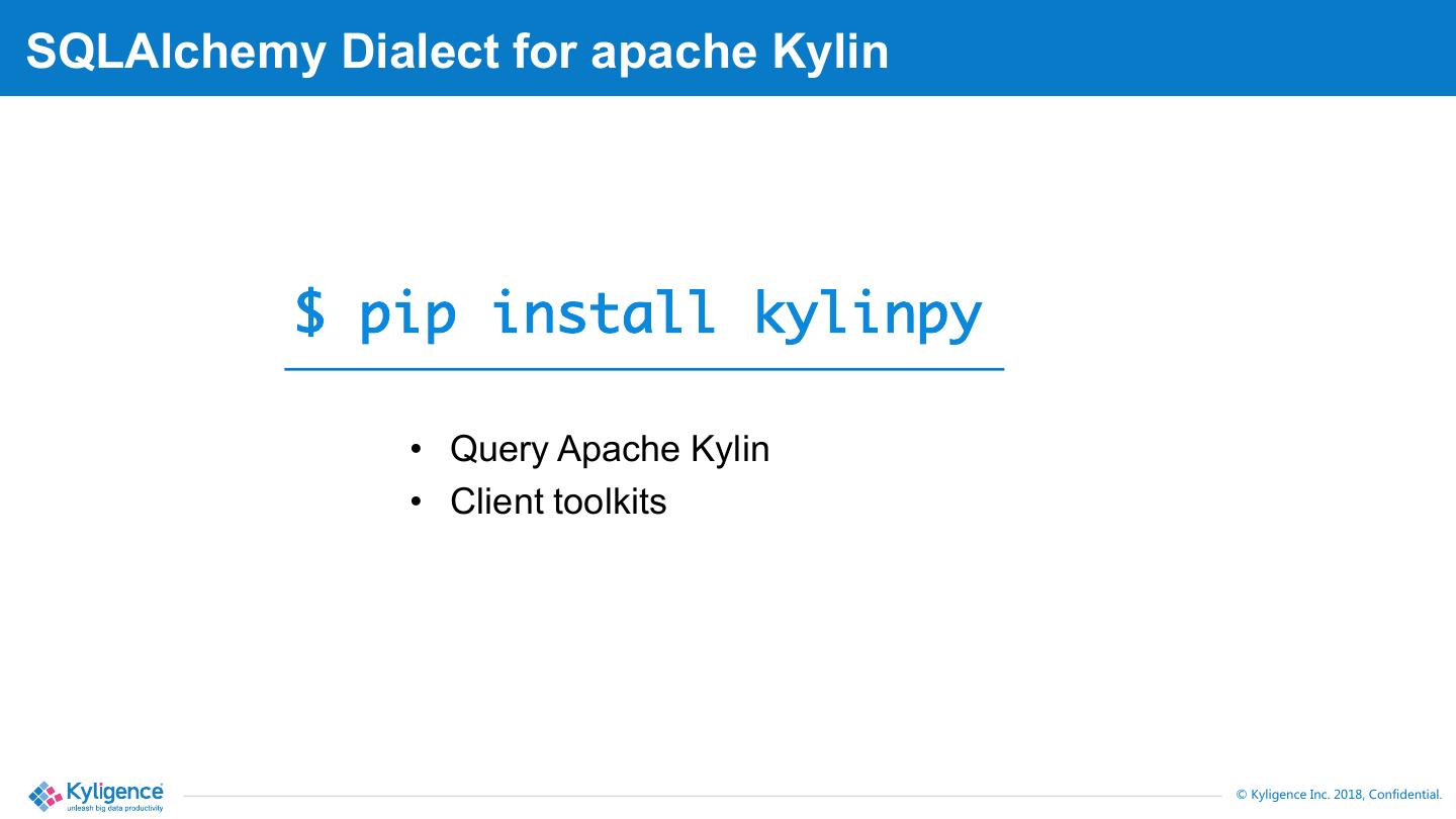 5 .SQLAlchemy Dialect for apache Kylin $ pip install kylinpy • Query Apache Kylin • Client toolkits 1 0, . ,