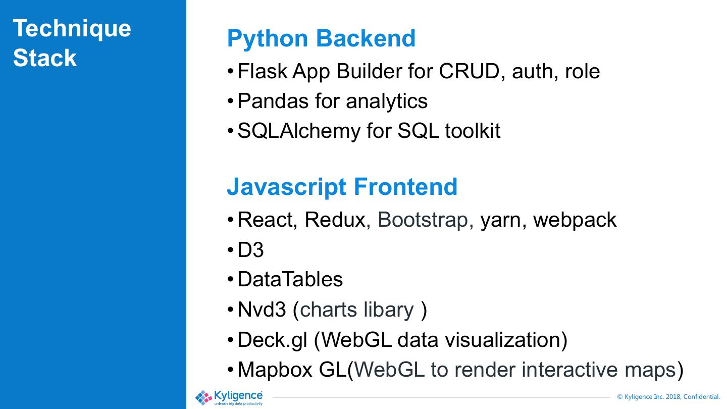 21 .Technique Python Backend Stack • Flask App Builder for CRUD, auth, role • Pandas for analytics • SQLAlchemy for SQL toolkit Javascript Frontend • React, Redux, Bootstrap, yarn, webpack • D3 • DataTables • Nvd3 (charts libary ) • Deck.gl (WebGL data visualization) • Mapbox GL(WebGL to render interactive maps) 1 0, . ,