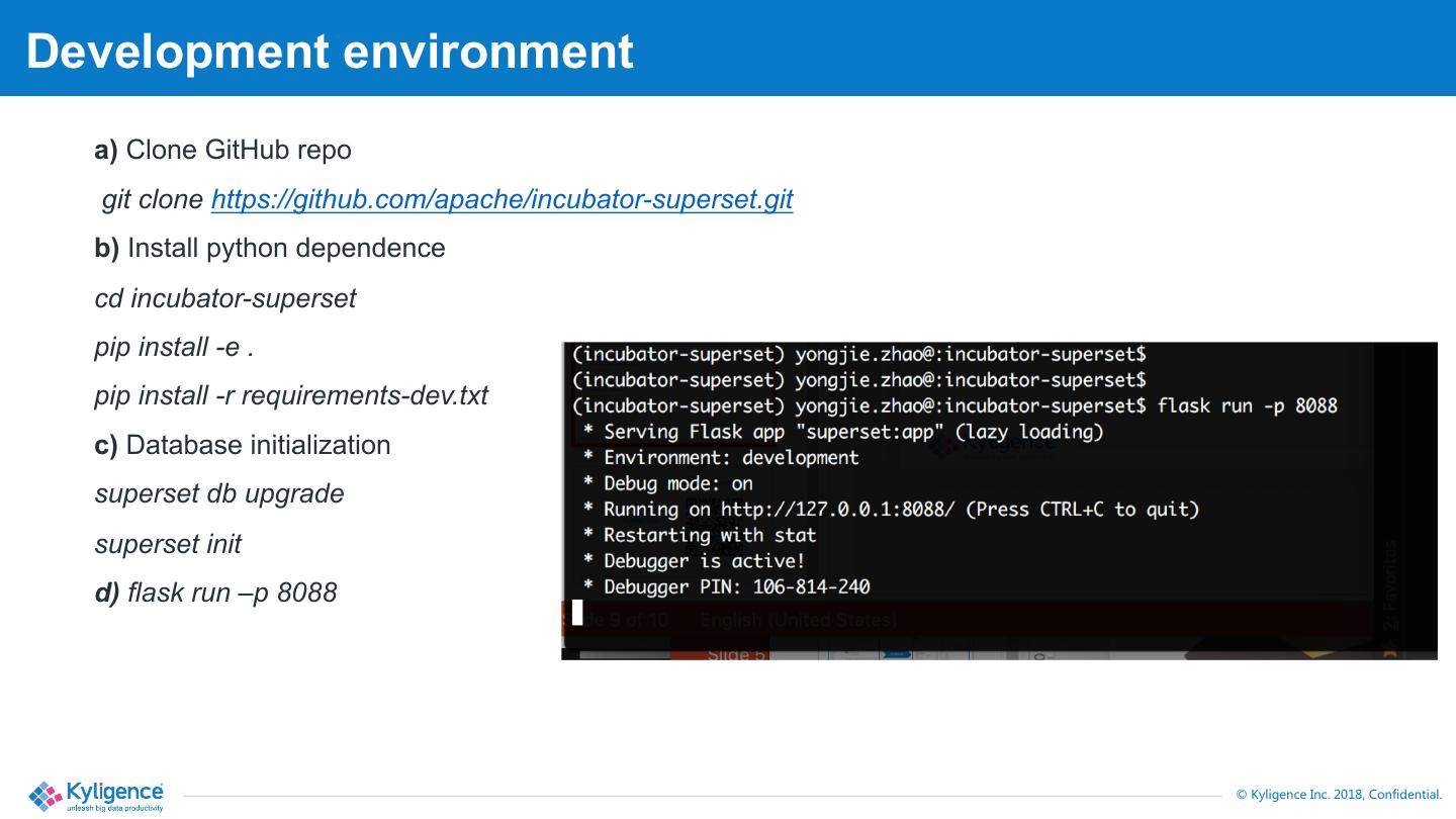 23 .Development environment a) Clone GitHub repo git clone https://github.com/apache/incubator-superset.git b) Install python dependence cd incubator-superset pip install -e . pip install -r requirements-dev.txt c) Database initialization superset db upgrade superset init d) flask run –p 8088 1 0, . ,