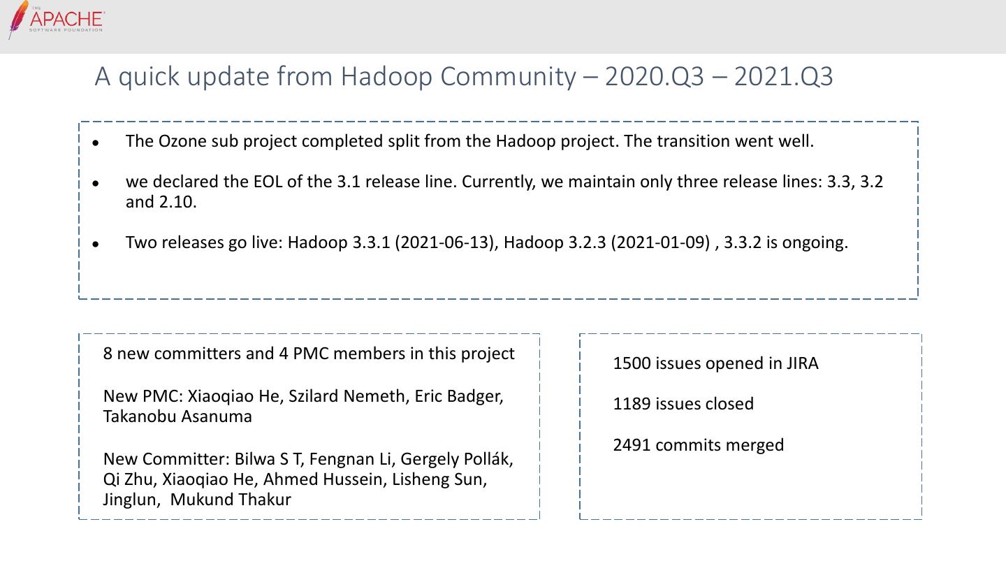 3 .A quick update from Hadoop Community – 2020.Q3 – 2021.Q3 ● The Ozone sub project completed split from the Hadoop project. The transition went well. ● we declared the EOL of the 3.1 release line. Currently, we maintain only three release lines: 3.3, 3.2 and 2.10. ● Two releases go live: Hadoop 3.3.1 (2021-06-13), Hadoop 3.2.3 (2021-01-09) , 3.3.2 is ongoing. 8 new committers and 4 PMC members in this project 1500 issues opened in JIRA New PMC: Xiaoqiao He, Szilard Nemeth, Eric Badger, 1189 issues closed Takanobu Asanuma 2491 commits merged New Committer: Bilwa S T, Fengnan Li, Gergely Pollák, Qi Zhu, Xiaoqiao He, Ahmed Hussein, Lisheng Sun, Jinglun, Mukund Thakur