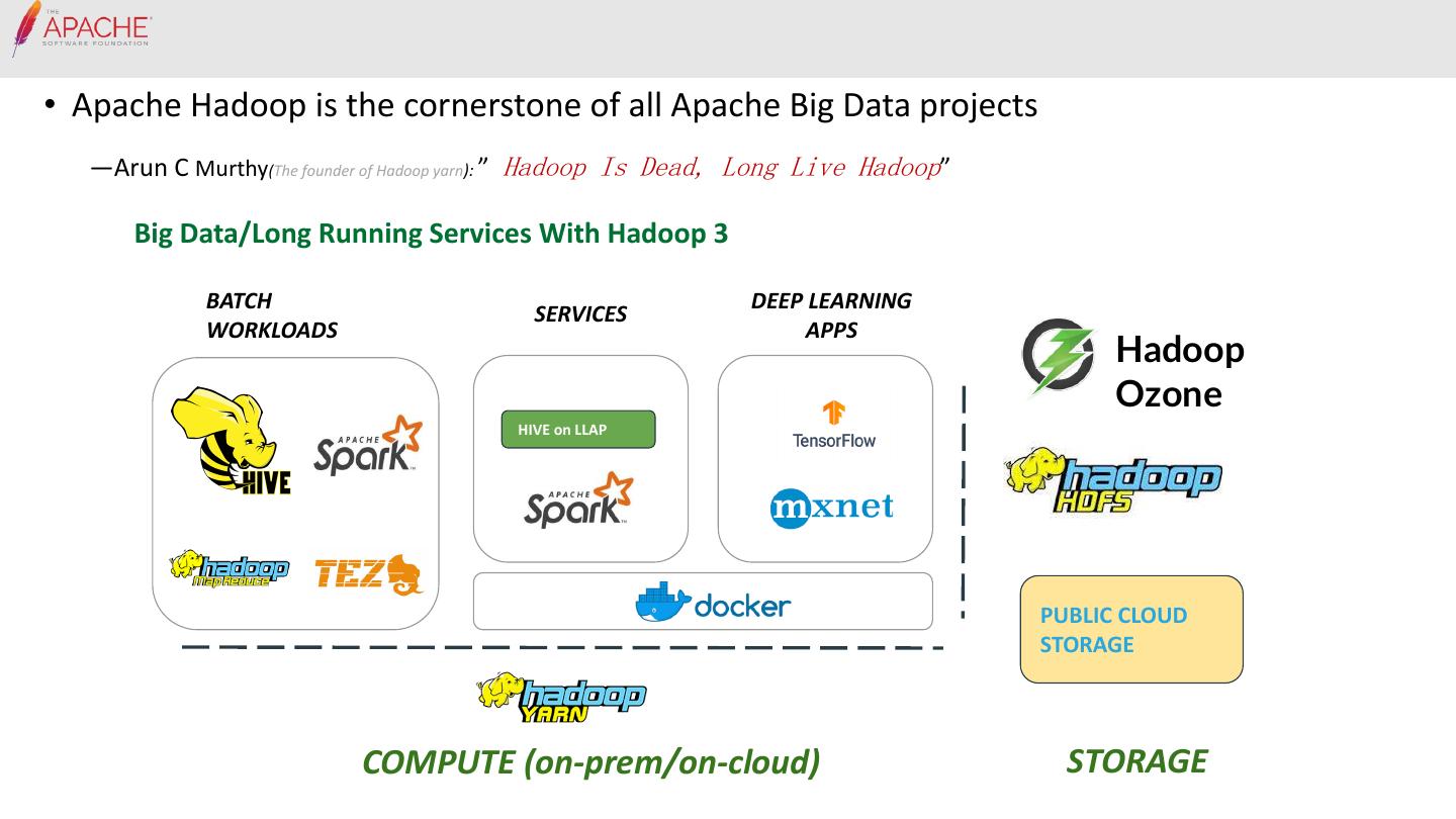 6 .• Apache Hadoop is the cornerstone of all Apache Big Data projects —Arun C Murthy(The founder of Hadoop yarn): ” Hadoop Is Dead, Long Live Hadoop” Big Data/Long Running Services With Hadoop 3 BATCH DEEP LEARNING SERVICES WORKLOADS APPS Hadoop Ozone HIVE on LLAP PUBLIC CLOUD STORAGE COMPUTE (on-prem/on-cloud) STORAGE