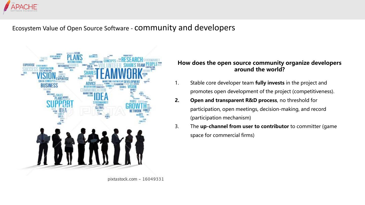 9 .Ecosystem Value of Open Source Software - community and developers How does the open source community organize developers around the world? 1. Stable core developer team fully invests in the project and promotes open development of the project (competitiveness). 2. Open and transparent R&D process, no threshold for participation, open meetings, decision-making, and record (participation mechanism) 3. The up-channel from user to contributor to committer (game space for commercial firms)