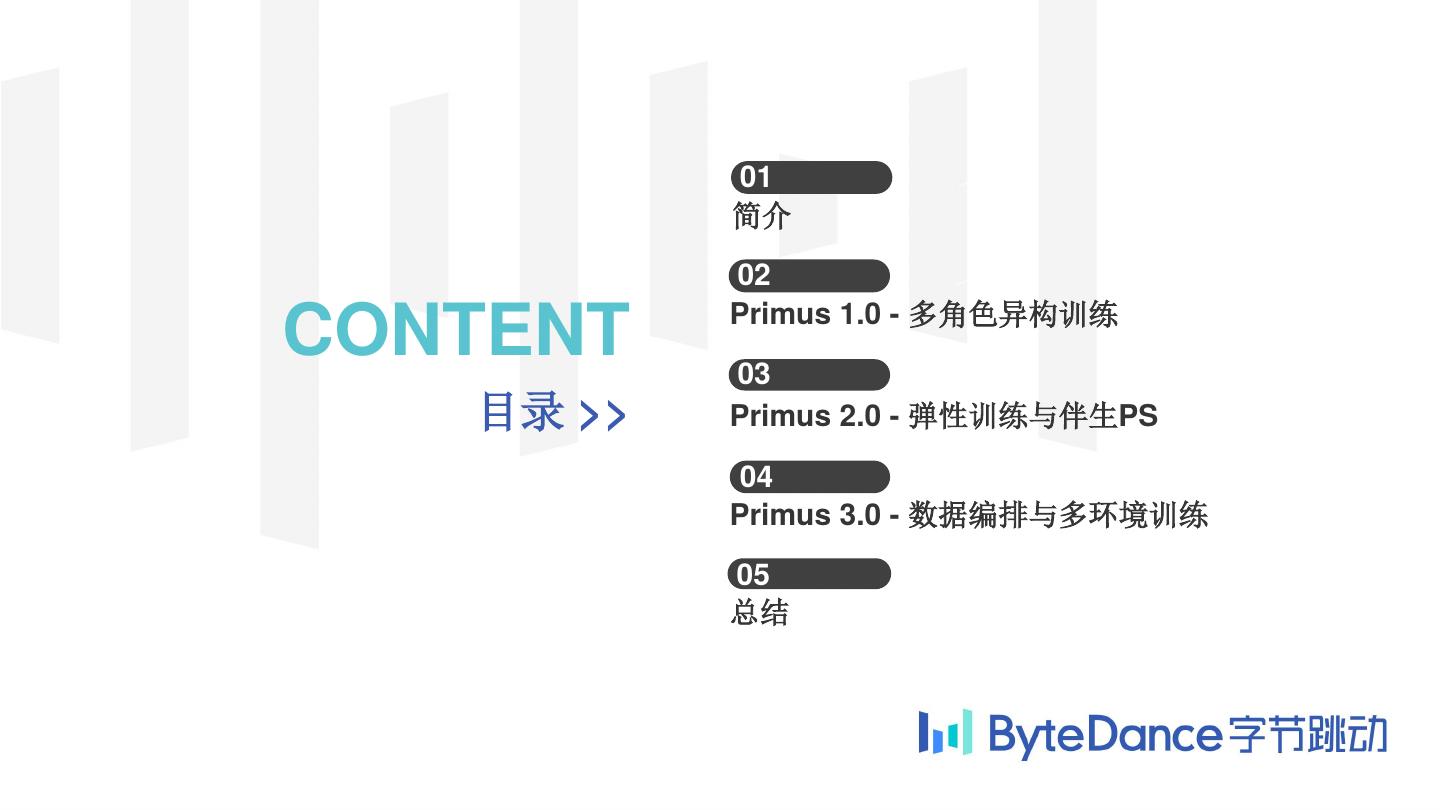 3 . 01 简介 02 Primus 1.0 - 多角色异构训练 CONTENT 03 目录 >> Primus 2.0 - 弹性训练与伴生PS 04 Primus 3.0 - 数据编排与多环境训练 05 总结