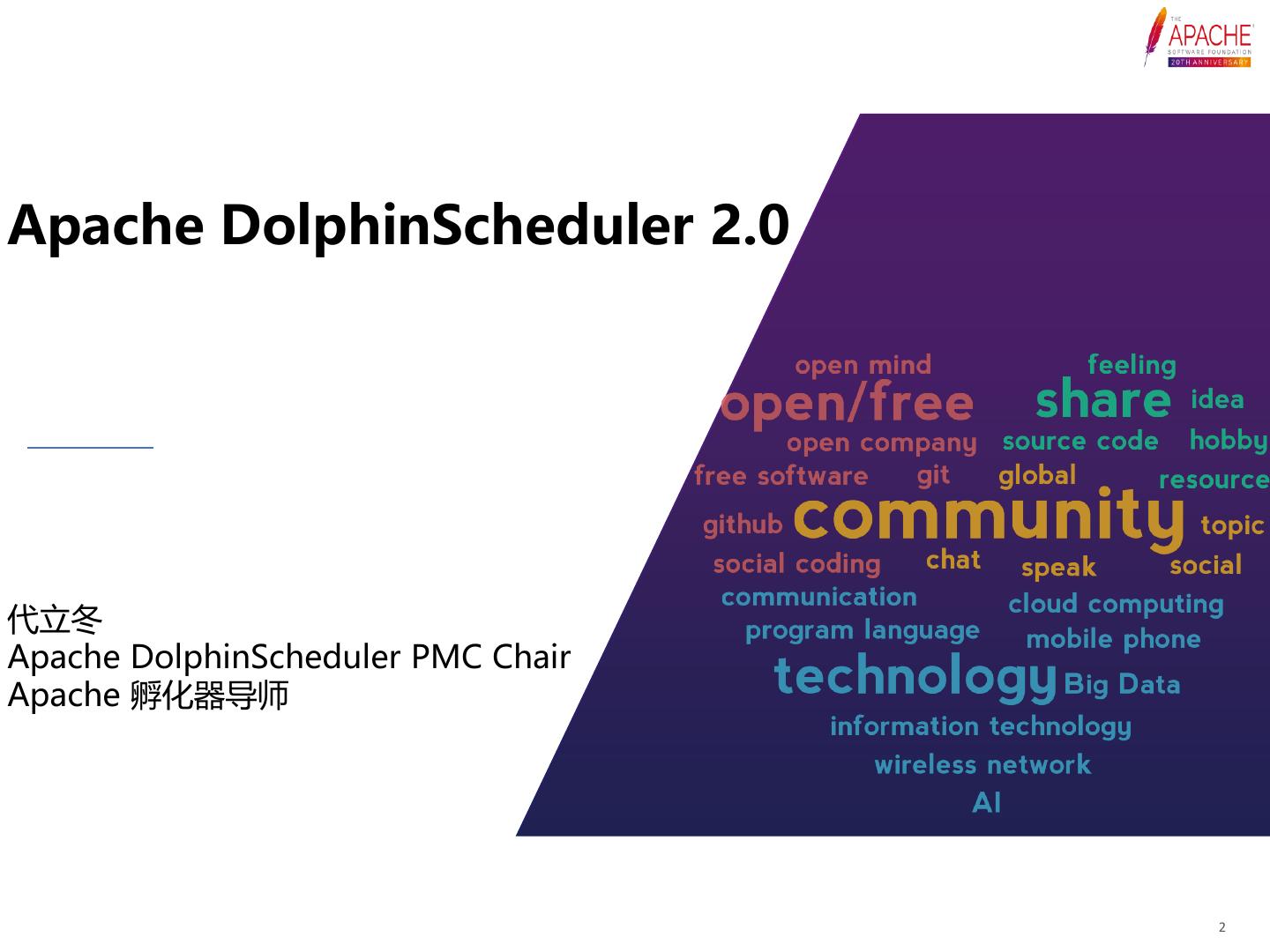 2 .Apache DolphinScheduler 2.0 代立冬 Apache DolphinScheduler PMC Chair Apache 孵化器导师 2
