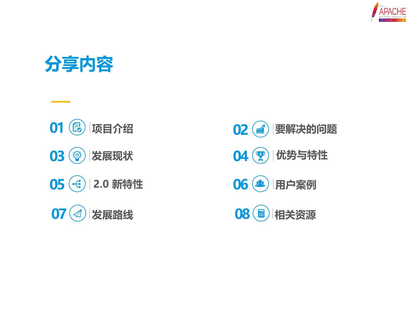 3 .分享内容 01 项目介绍 02 要解决的问题 03 发展现状 04 优势与特性 05 2.0 新特性 06 用户案例 07 发展路线 08 相关资源