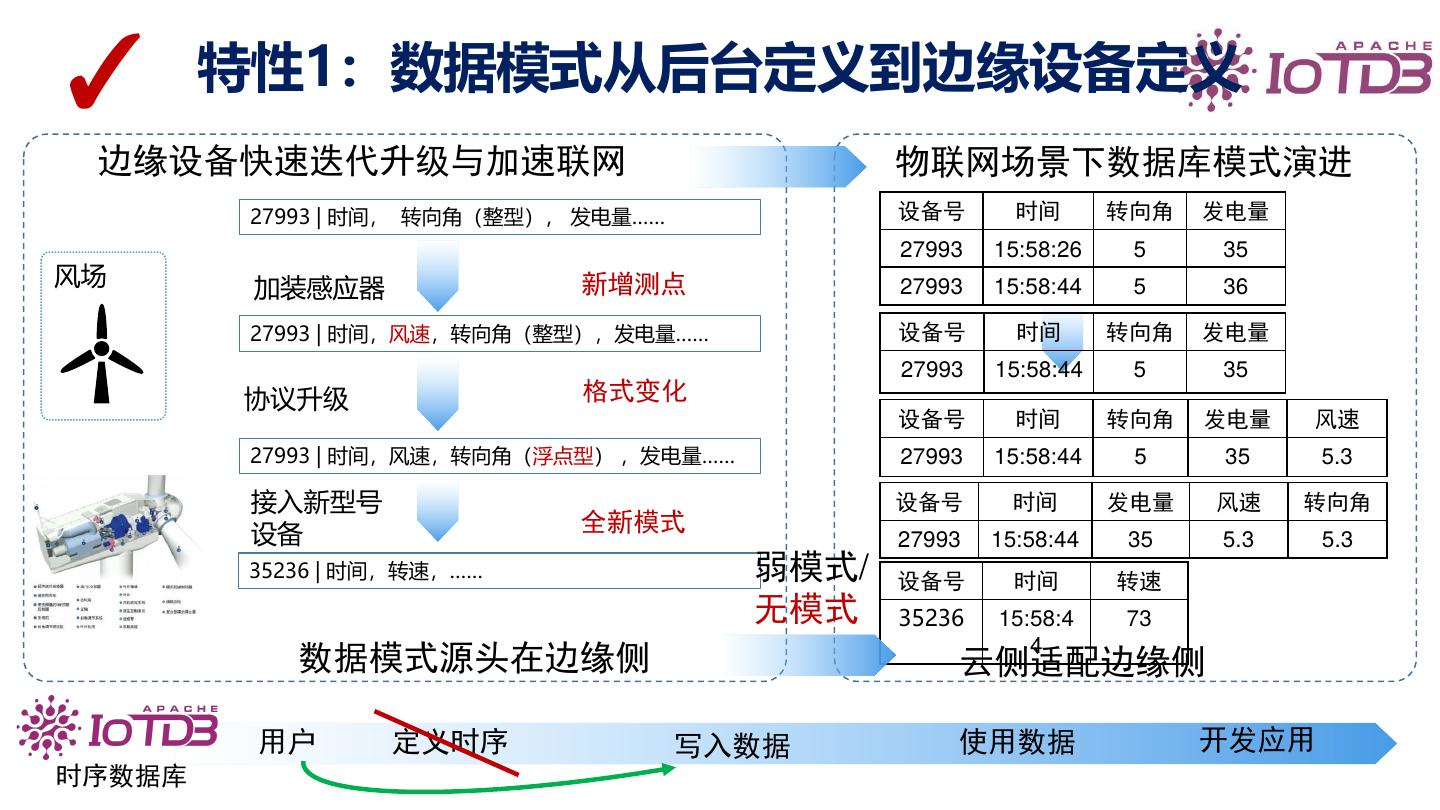 10 .✓ 特性1:数据模式从后台定义到边缘设备定义 边缘设备快速迭代升级与加速联网 物联网场景下数据库模式演进 27993 | 时间, 转向角(整型), 发电量…… 设备号 时间 转向角 发电量 27993 15:58:26 5 35 风场 加装感应器 新增测点 27993 15:58:44 5 36 27993 | 时间,风速,转向角(整型),发电量…… 设备号 时间 转向角 发电量 27993 15:58:44 5 35 协议升级 格式变化 设备号 时间 转向角 发电量 风速 27993 | 时间,风速,转向角(浮点型) ,发电量…… 27993 15:58:44 5 35 5.3 接入新型号 设备号 时间 发电量 风速 转向角 设备 全新模式 27993 15:58:44 35 5.3 5.3 35236 | 时间,转速,…… 弱模式/ 设备号 时间 转速 无模式 35236 15:58:4 73 4 数据模式源头在边缘侧 云侧适配边缘侧 用户 定义时序 写入数据 使用数据 开发应用 时序数据库