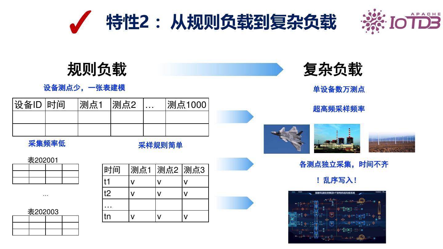 11 . ✓ 特性2 :从规则负载到复杂负载 规则负载 复杂负载 设备测点少,一张表建模 单设备数万测点 设备ID 时间 测点1 测点2 … 测点1000 超高频采样频率 采集频率低 采样规则简单 表202001 各测点独立采集,时间不齐 时间 测点1 测点2 测点3 t1 v v v !乱序写入! … t2 v v v … 表202003 tn v v v