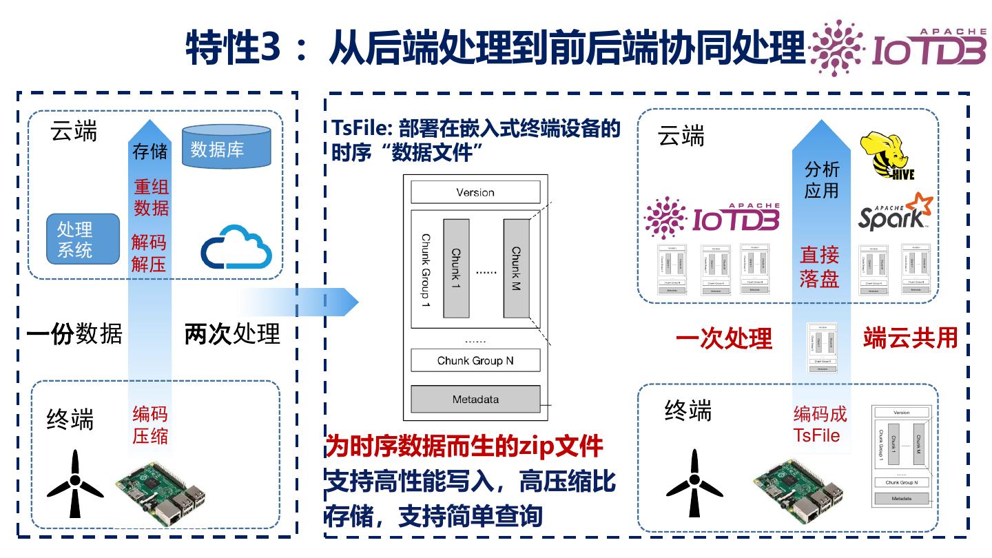12 . 特性3 :从后端处理到前后端协同处理 云端 TsFile: 部署在嵌入式终端设备的 云端 存储 数据库 时序“数据文件” 分析 重组 应用 数据 处理 系统 解码 解压 直接 落盘 一份数据 两次处理 一次处理 端云共用 终端 编码 终端 编码成 压缩 为时序数据而生的zip文件 TsFile 支持高性能写入,高压缩比 存储,支持简单查询