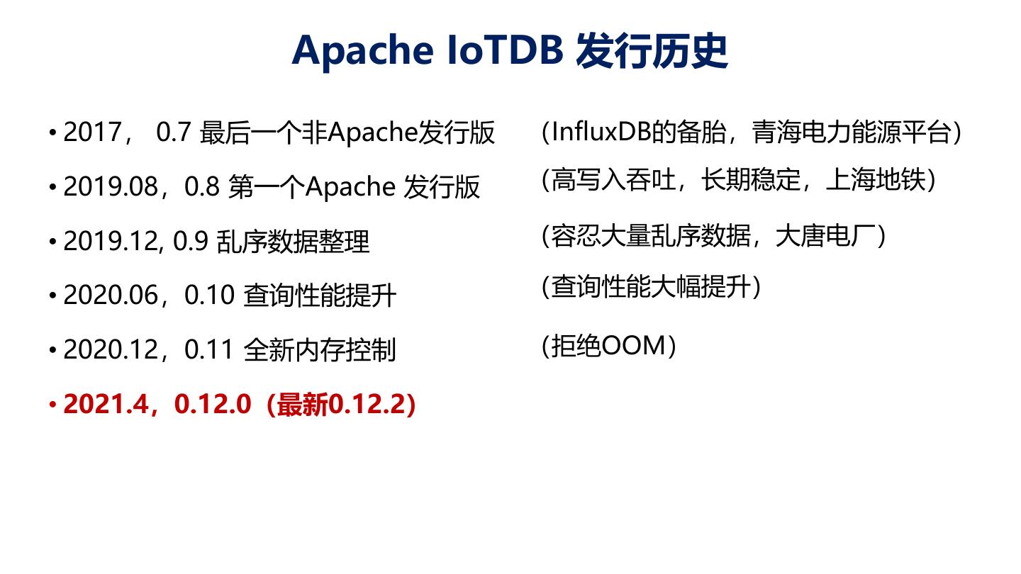 13 . Apache IoTDB 发行历史 • 2017, 0.7 最后一个非Apache发行版 (InfluxDB的备胎,青海电力能源平台) • 2019.08,0.8 第一个Apache 发行版 (高写入吞吐,长期稳定,上海地铁) • 2019.12, 0.9 乱序数据整理 (容忍大量乱序数据,大唐电厂) • 2020.06,0.10 查询性能提升 (查询性能大幅提升) • 2020.12,0.11 全新内存控制 (拒绝OOM) • 2021.4,0.12.0(最新0.12.2)