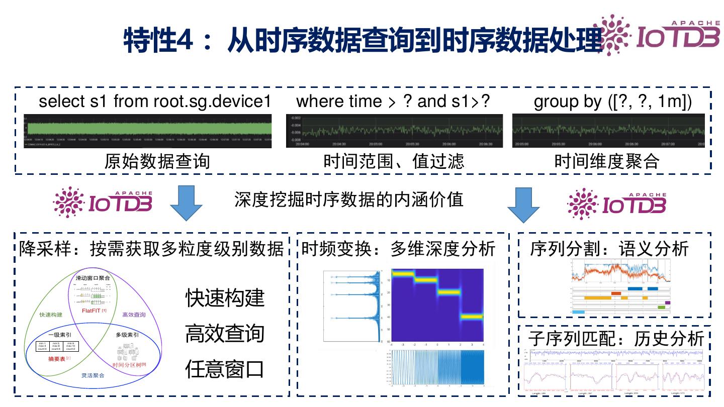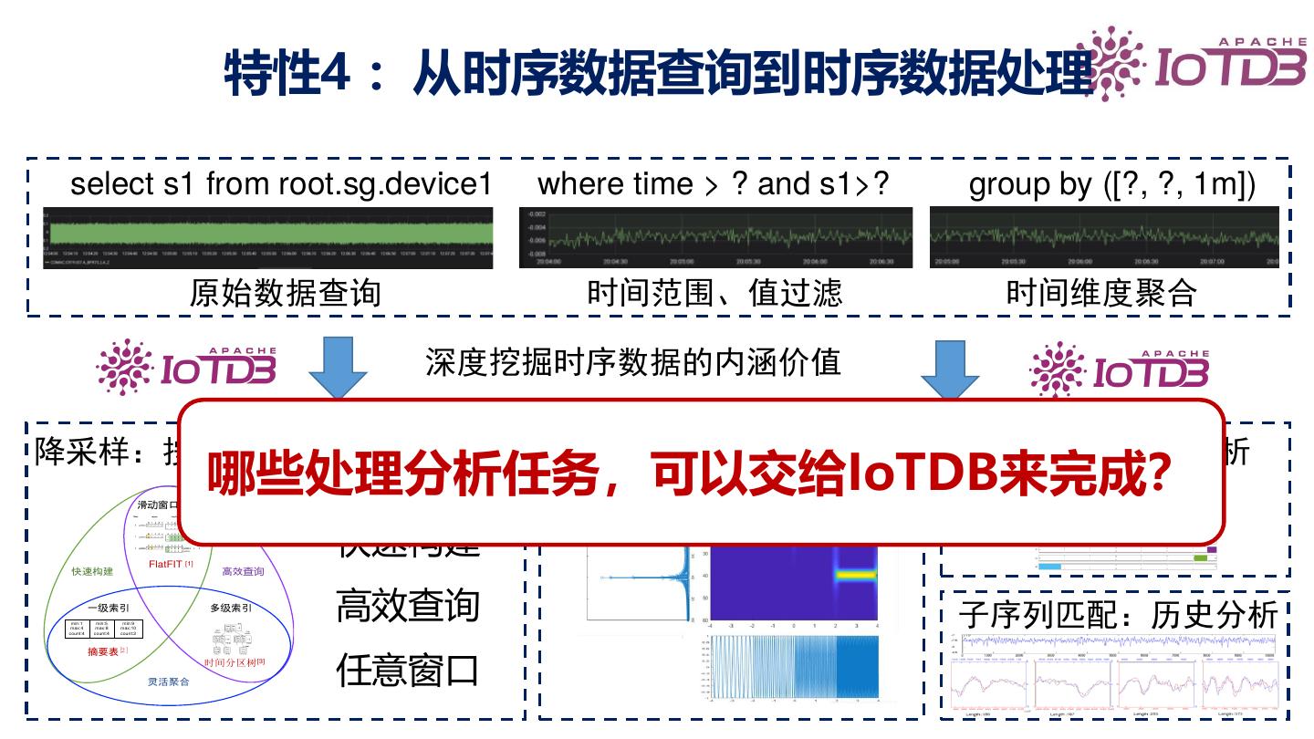 16 . 特性4 :从时序数据查询到时序数据处理 select s1 from root.sg.device1 where time > ? and s1>? group by ([?, ?, 1m]) 原始数据查询 时间范围、值过滤 时间维度聚合 深度挖掘时序数据的内涵价值 降采样:按需获取多粒度级别数据 时频变换:多维深度分析 序列分割:语义分析 滑动窗口聚合 哪些处理分析任务,可以交给IoTDB来完成? FlatFIT [1] 快速构建 快速构建 高效查询 摘要 min:1 max:4 count:4 一级索引 min:5 max:8 count:4 min:9 max:10 count:2 多级索引 高效查询 子序列匹配:历史分析 任意窗口 摘要表[2] 时间分区树[3] 灵活聚合