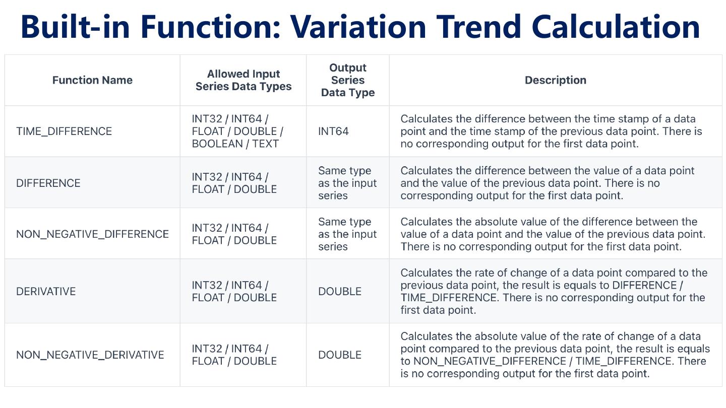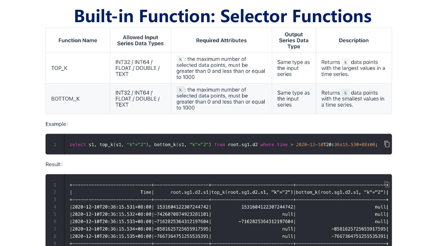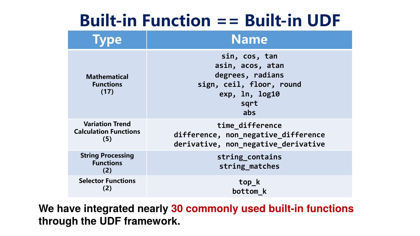 20 . Built-in Function == Built-in UDF Type Name sin, cos, tan asin, acos, atan Mathematical degrees, radians Functions sign, ceil, floor, round (17) exp, ln, log10 sqrt abs Variation Trend time_difference Calculation Functions (5) difference, non_negative_difference derivative, non_negative_derivative String Processing string_contains Functions (2) string_matches Selector Functions top_k (2) bottom_k We have integrated nearly 30 commonly used built-in functions through the UDF framework.