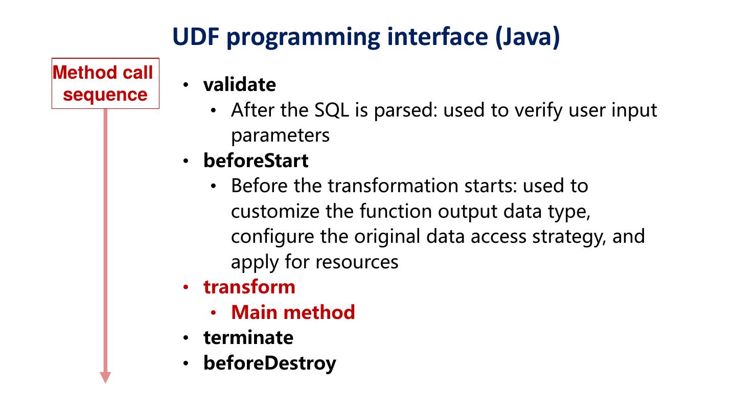 25 . UDF programming interface (Java) Method call • validate sequence • After the SQL is parsed: used to verify user input parameters • beforeStart • Before the transformation starts: used to customize the function output data type, configure the original data access strategy, and apply for resources • transform • Main method • terminate • beforeDestroy