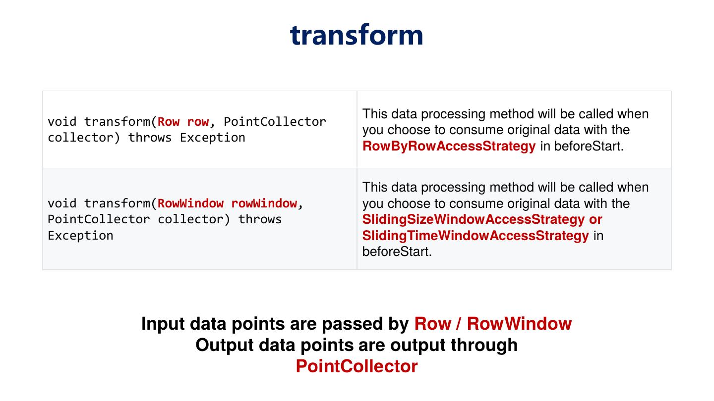 26 . transform This data processing method will be called when void transform(Row row, PointCollector you choose to consume original data with the collector) throws Exception RowByRowAccessStrategy in beforeStart. This data processing method will be called when void transform(RowWindow rowWindow, you choose to consume original data with the PointCollector collector) throws SlidingSizeWindowAccessStrategy or Exception SlidingTimeWindowAccessStrategy in beforeStart. Input data points are passed by Row / RowWindow Output data points are output through PointCollector