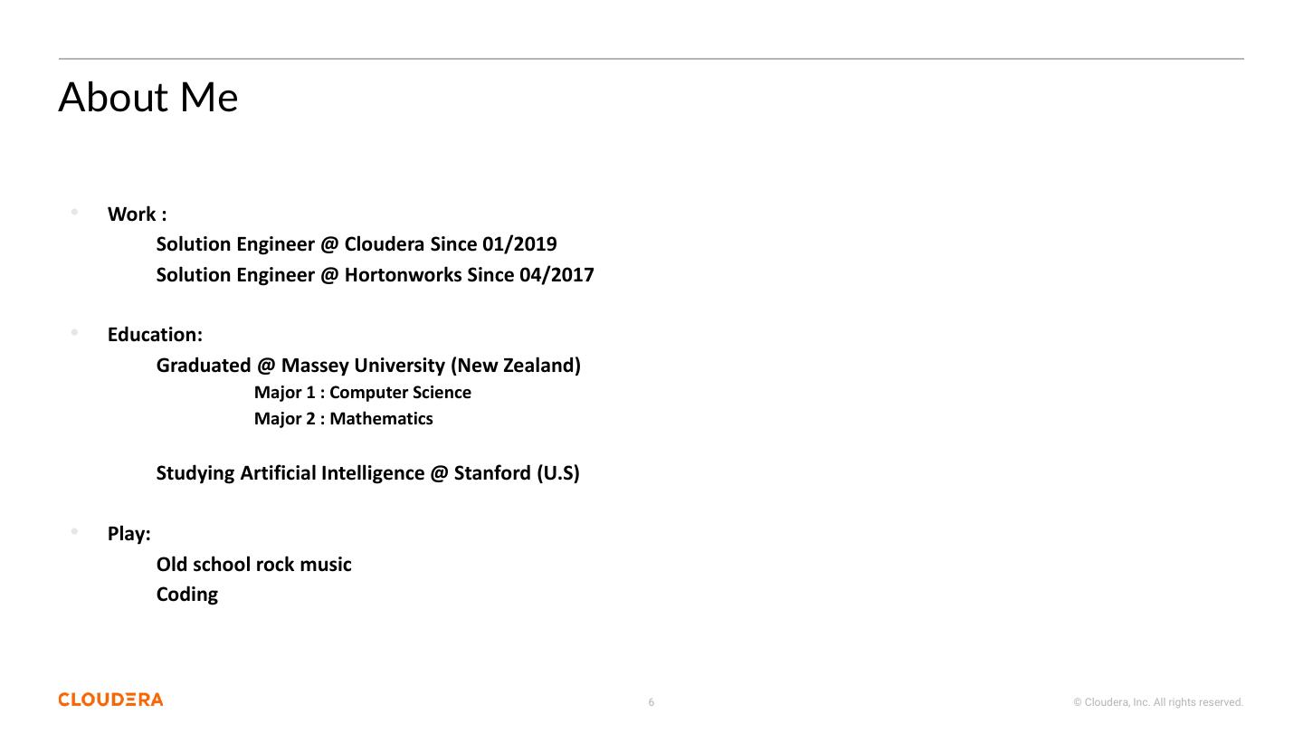 6 .About Me • Work : Solution Engineer @ Cloudera Since 01/2019 Solution Engineer @ Hortonworks Since 04/2017 • Education: Graduated @ Massey University (New Zealand) Major 1 : Computer Science Major 2 : Mathematics Studying Artificial Intelligence @ Stanford (U.S) • Play: Old school rock music Coding 6 © Cloudera, Inc. All rights reserved.