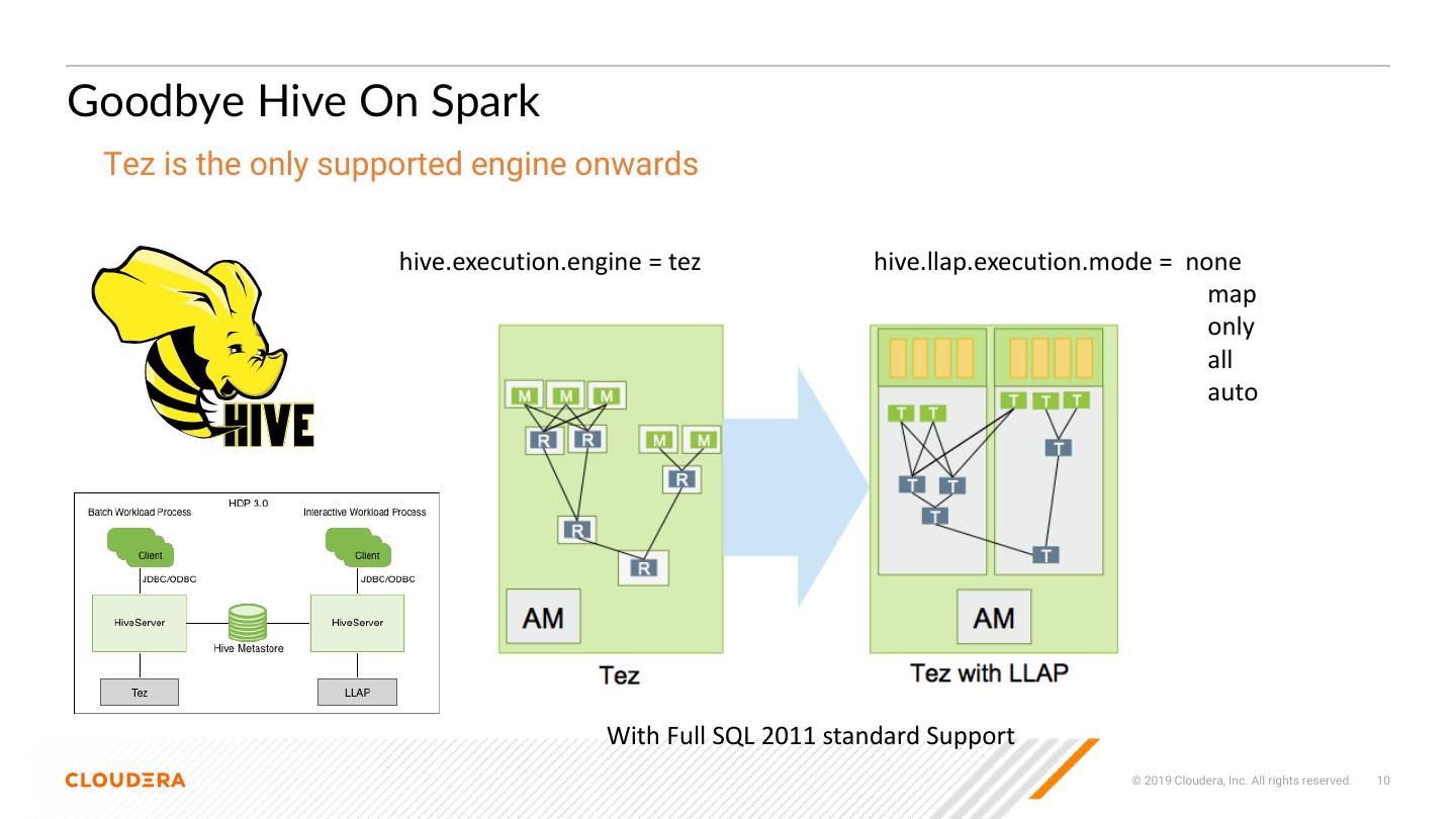 10 .Goodbye Hive On Spark Tez is the only supported engine onwards hive.execution.engine = tez hive.llap.execution.mode = none map only all auto With Full SQL 2011 standard Support © 2019 Cloudera, Inc. All rights reserved. 10